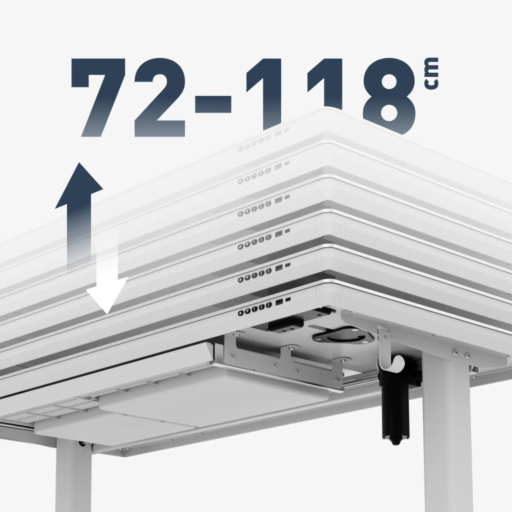 Állítható magasságú íróasztal, 120 x 60 cm, fejhallgatótartóval, üveglappal fehér