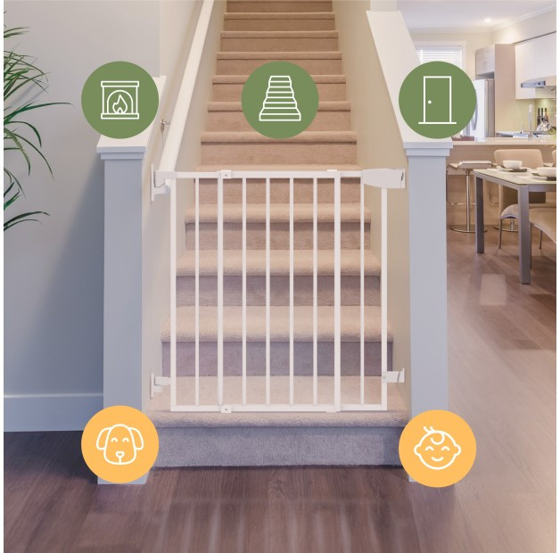 A sima anyagnak és a lekerekített elemeknek köszönhetően a biztonsági kapu teljesen biztonságos, még a kicsik közvetlen közelében is.