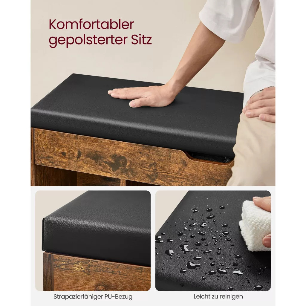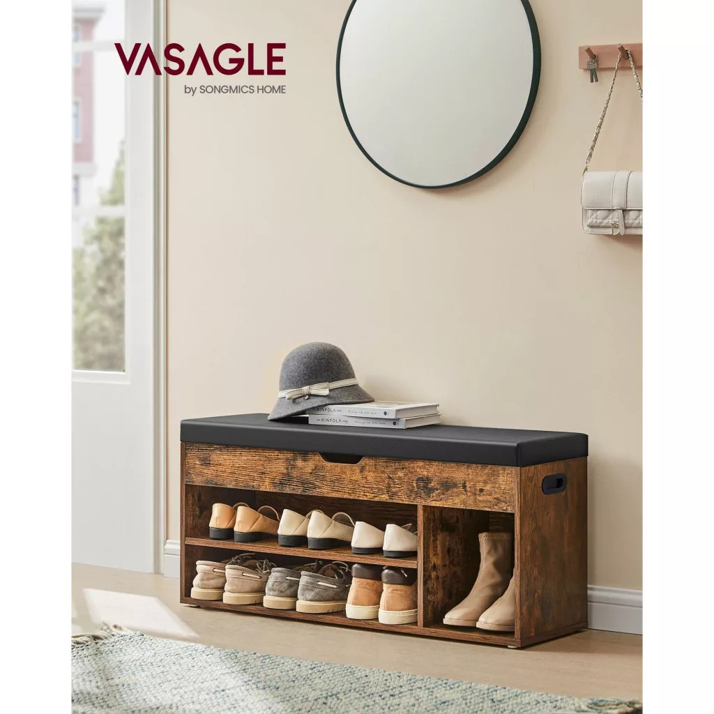 VASAGLE Cipőtároló pad, párnázott ülőfelülettel, felnyitható, rusztikus barna 100x30x44cm