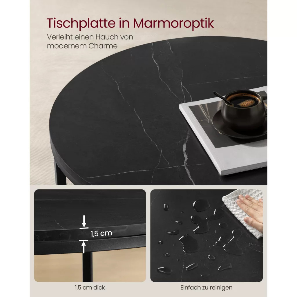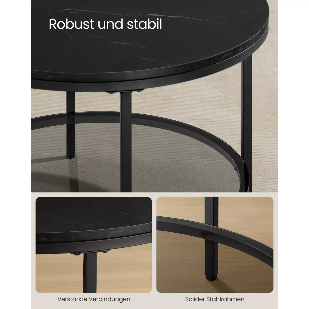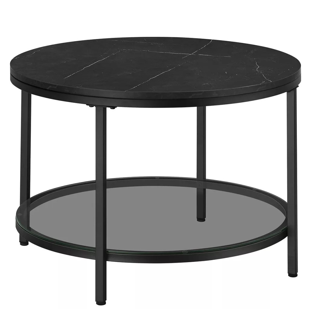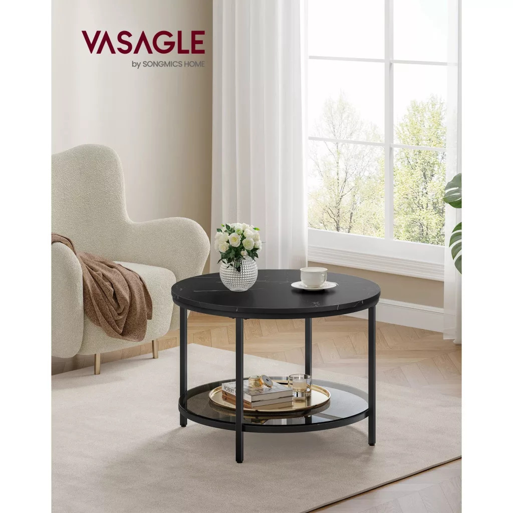 VASAGLE Dohányzóasztal, műmárvány asztallap, edzett üveg polc, márvány fekete, fekete, 65cm átmérő