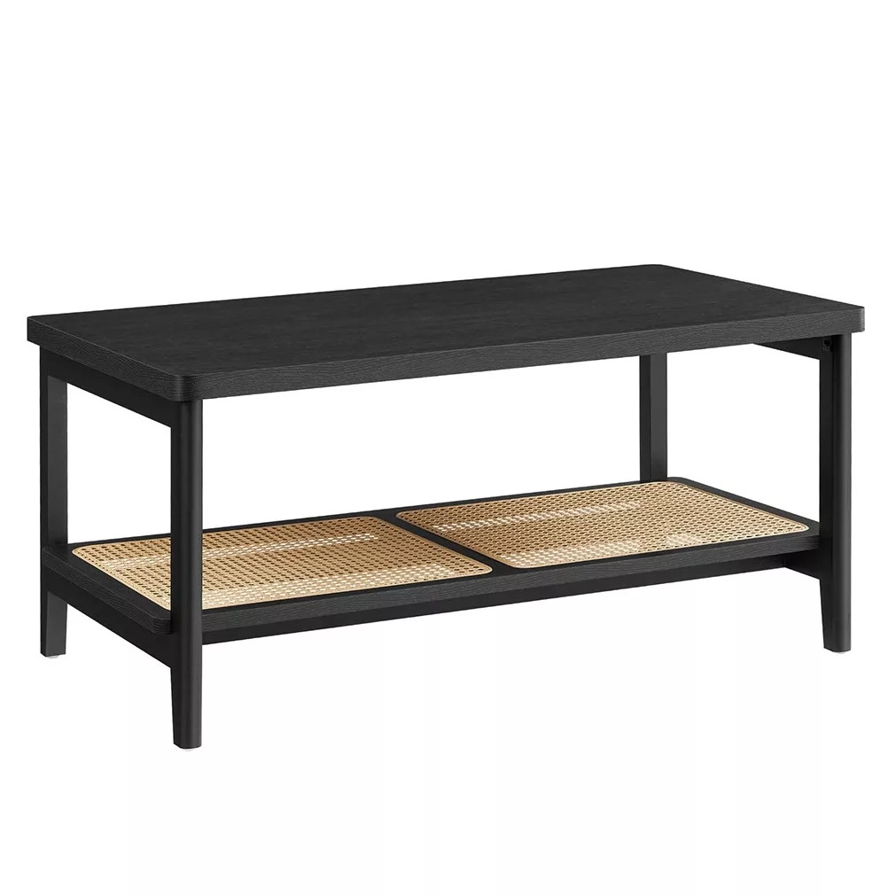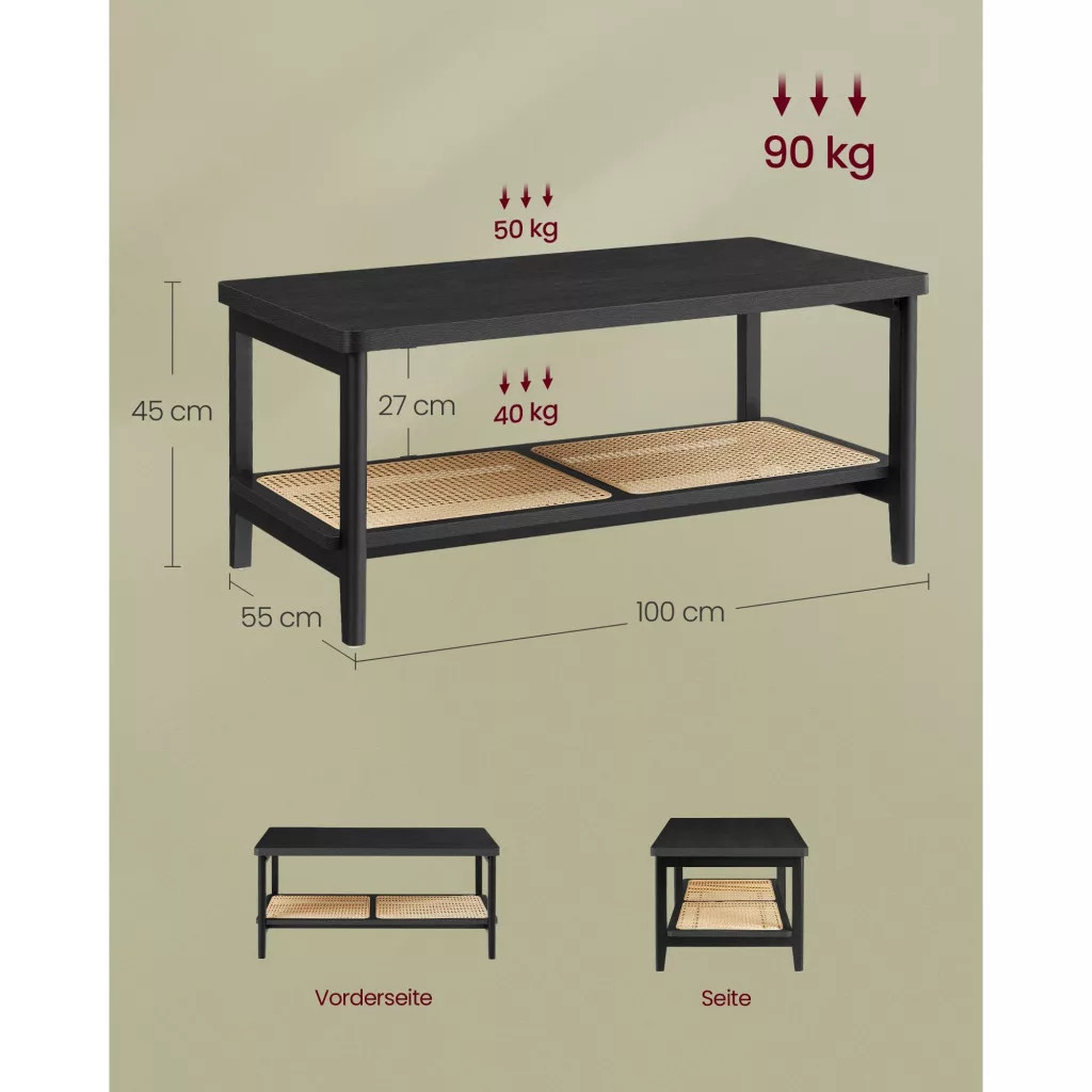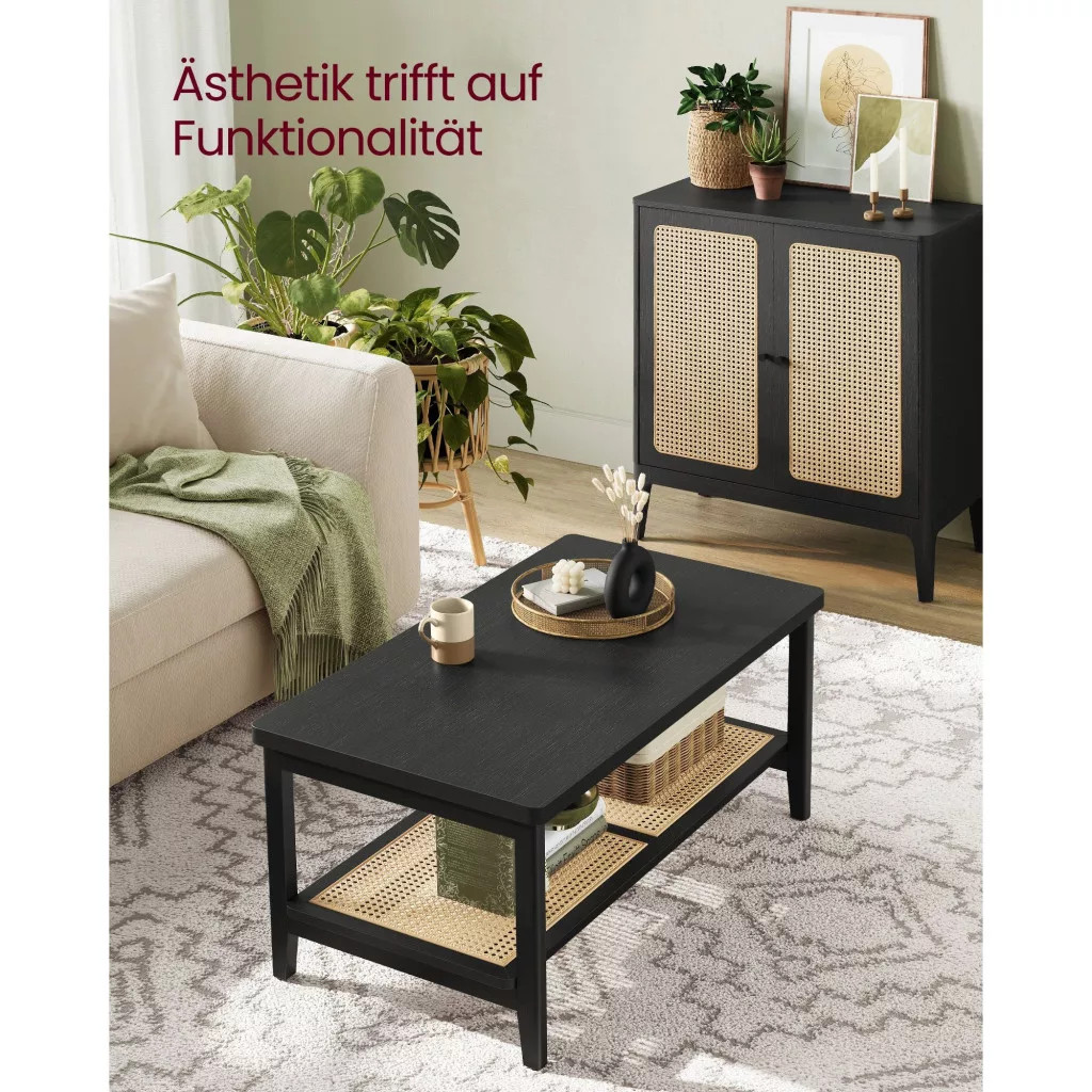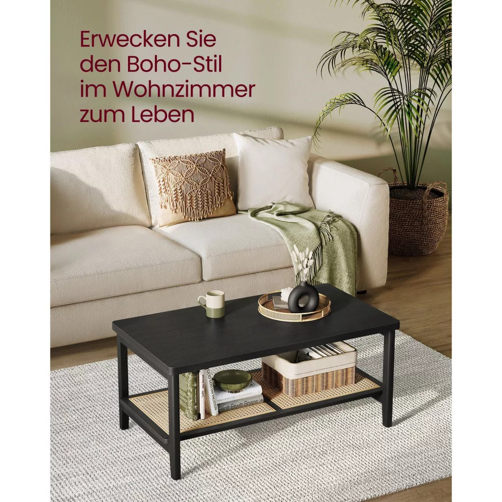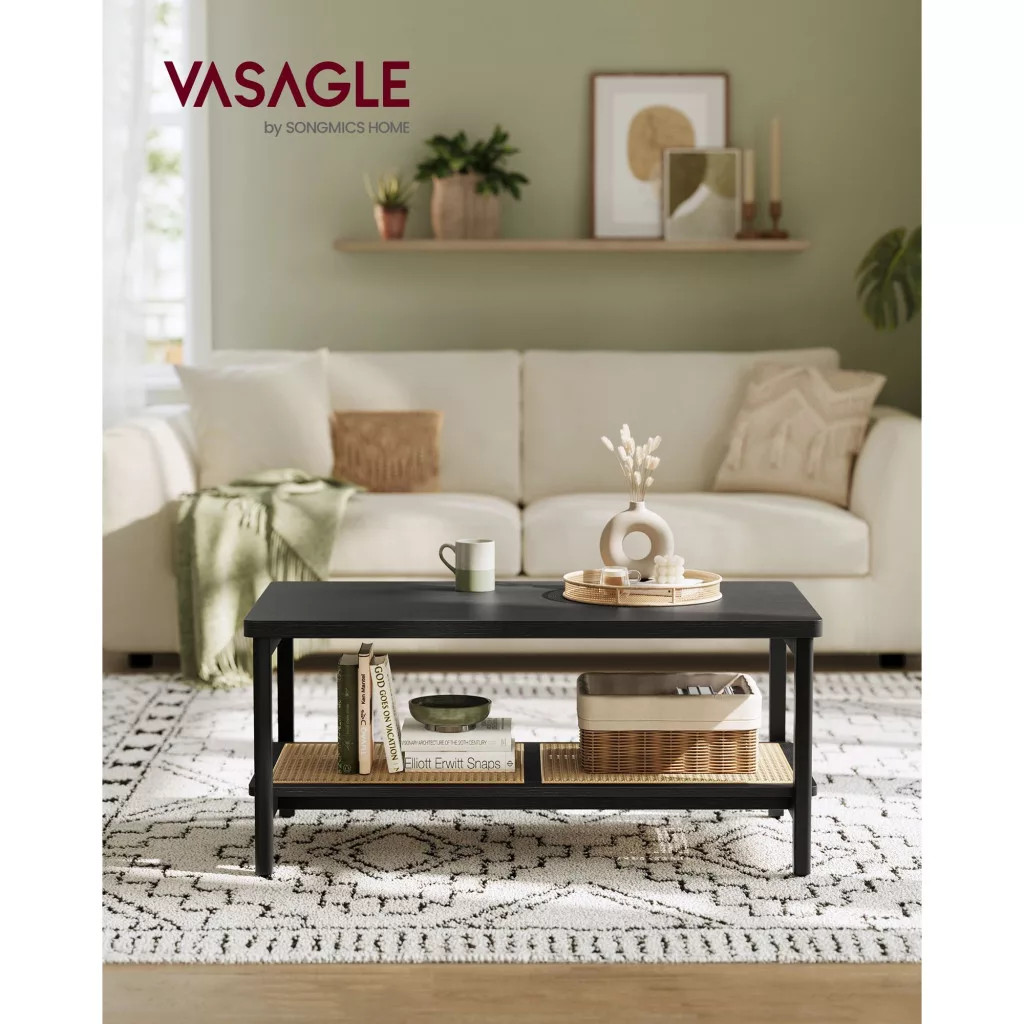 VASAGLE Dohányzóasztal, műrattan tárolópolc, lekerekített sarkok, fekete kőris 100x55x45cm