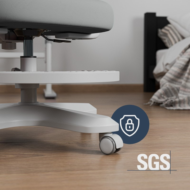 A Junior szék egy görgők rögzítő mechanizmusával van felszerelve, amely stabilizálja a széket ülés közben. Ez lehetővé teszi, hogy a gyermek kényelmesen, kontrollálatlan mozgás nélkül használhassa az íróasztalt. Ez a praktikus megoldás lehetővé teszi, hogy jobban tudjon koncentrálni a tanulásra, a festésre vagy a házi feladat elkészítésére.