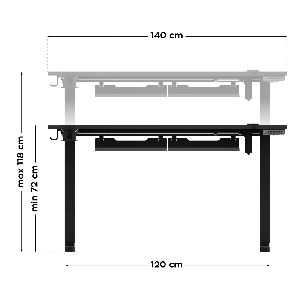KÜLÖNLEGES JELLEMZŐK: Ergonomikus elektromos íróasztal állítható felső magassággal és LED világítással Nagy állítási tartomány: asztallap magassága 72-118 cm Beépített induktív töltő 10W kimeneti teljesítménnyel RGB világítás – hatékony és energiatakarékos LED szalagok távirányítóval vezérelhető Vezérlőpult 3 állomásos memóriával + USB porttal Ütközésgátló rendszer és túlmelegedés elleni védelem Csendes, sima működés: az asztallap 20 mm/s sebességgel emelkedik, 55 dB-t meg nem haladó zajszint mellett Asztallap mérete: 140 cm x 70 cm Maximális terhelés 70 kg-ig Az asztallap alatt elhelyezett rendszerezők kábelekhez és hosszabbítókhoz Tartók fejhallgató, táska, hátizsák és pohár számára