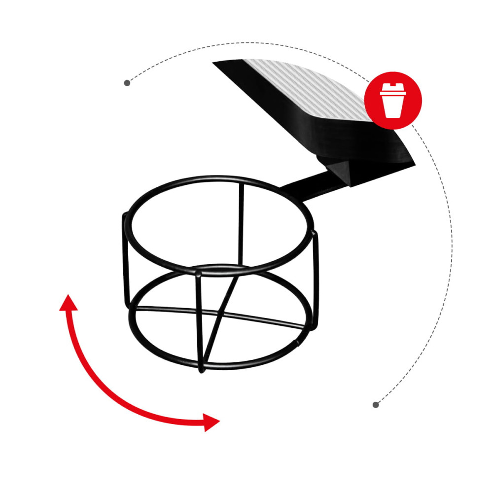 Különleges, kényelmes italtartó. Konzervdobozokat, palackokat vagy poharakat egyszerűen és biztonságosan tárolhat benne. Ez a megoldás megakadályozza a készülék elárasztását. A fogantyú könnyen és gyorsan összecsukható - az asztal alá rejtve.