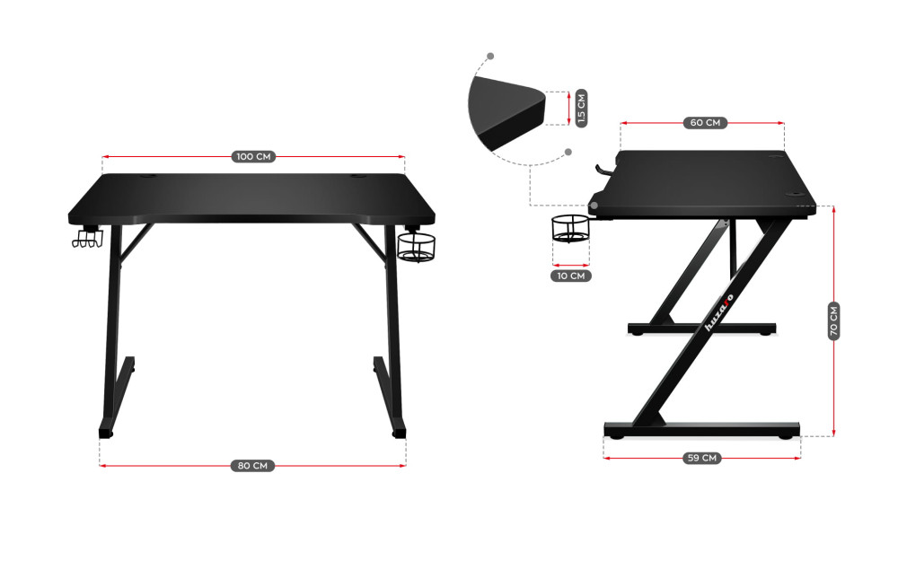A Huzaro Hero 1.8 íróasztal két lyukkal rendelkezik a kábelek rendezéséhez. A bemenetek szimmetrikusan vannak felszerelve az asztal mindkét oldalára, így játékállomása a telepítéstől függetlenül mindig rendben lesz.