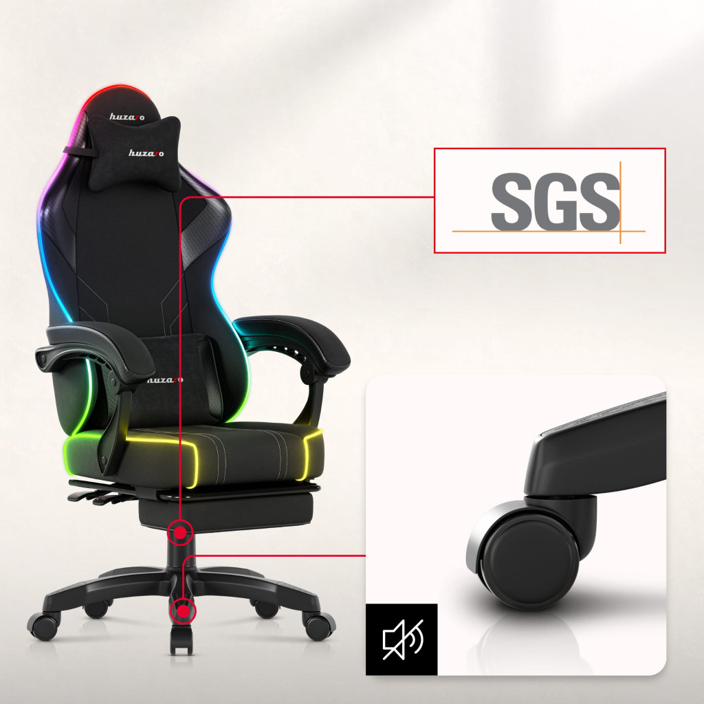 A távirányítóval vezérelhető beépített RGB világítás valódi változást hoz – válassz a színek teljes palettájáról, válts világítási módokat, és igazítsd a hangulatodat vagy játékstílusodat a hangulatodhoz. A dinamikus fényeffektek minden játékmenethez energiát adnak, a személyre szabás lehetősége pedig nemcsak ülőhellyé, hanem a környezeted központi elemévé is teszi a széket.