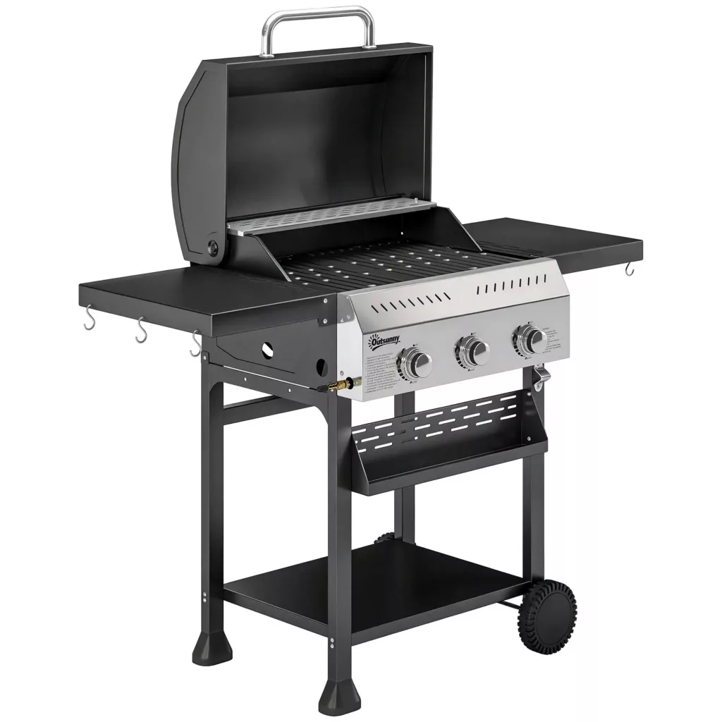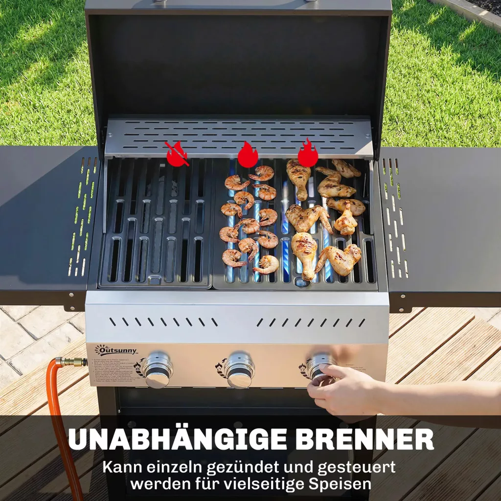 A gázgrill-partik gyakran kaotikusnak tűnnek, szétszórt eszközökkel és egyenetlen eredményekkel, ami stresszes lehet. Az Outsunny gázgrill rendet és élvezetet hoz a grillezésbe. Három nagy teljesítményű égőfej precíz hőmérővel biztosítja a tökéletes grillezési jelzéseket. Az összecsukható oldalsó asztalok és az integrált tárolóhely könnyen elérhetővé teszi a szószokat és a kiegészítőket – a nyugodt és élvezetes grillezési pillanatokért.