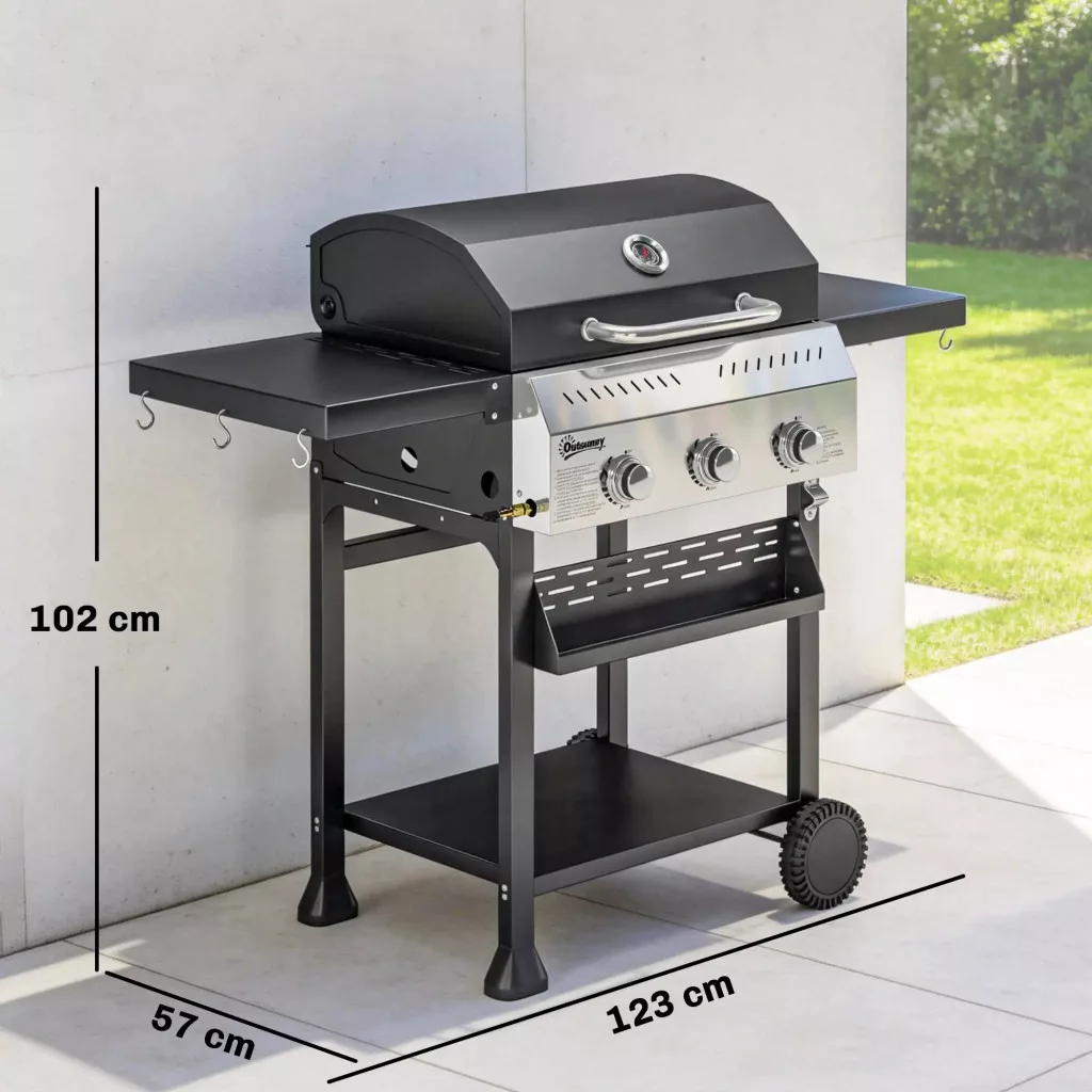 Nagy teljesítményű égők: A gázgrill három nagy teljesítményű, 3 kW-os rozsdamentes acél égője gyors felmelegedést biztosít, lehetővé téve több étel hatékony egyidejű elkészítését – tökéletes családi összejövetelekhez vagy laza hétvégi grillezésekhez hosszú várakozási idő nélkül.