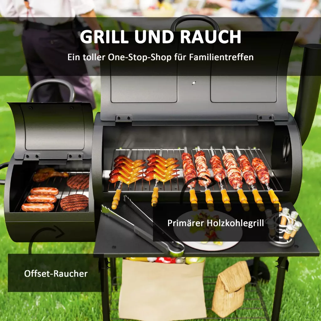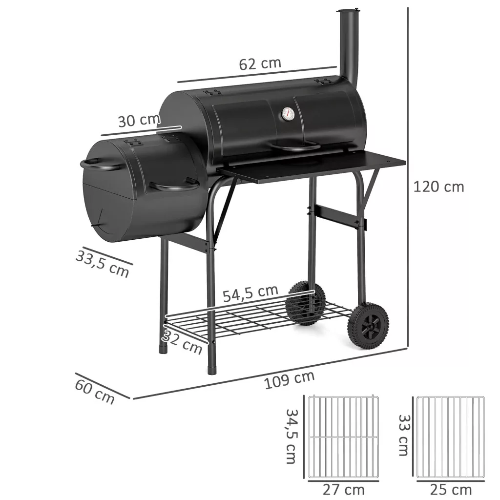 2 az 1-ben kialakítás: Ideális társasági összejövetelekhez, ez a faszenes grill fő grillsütővel és egy eltolt füstölővel rendelkezik. A tűztér tökéletesen elosztja a hőt, így finom füstös ízt kölcsönöz az ételnek, míg az állítható oldalsó szellőzőnyílás optimális légáramlást biztosít.
