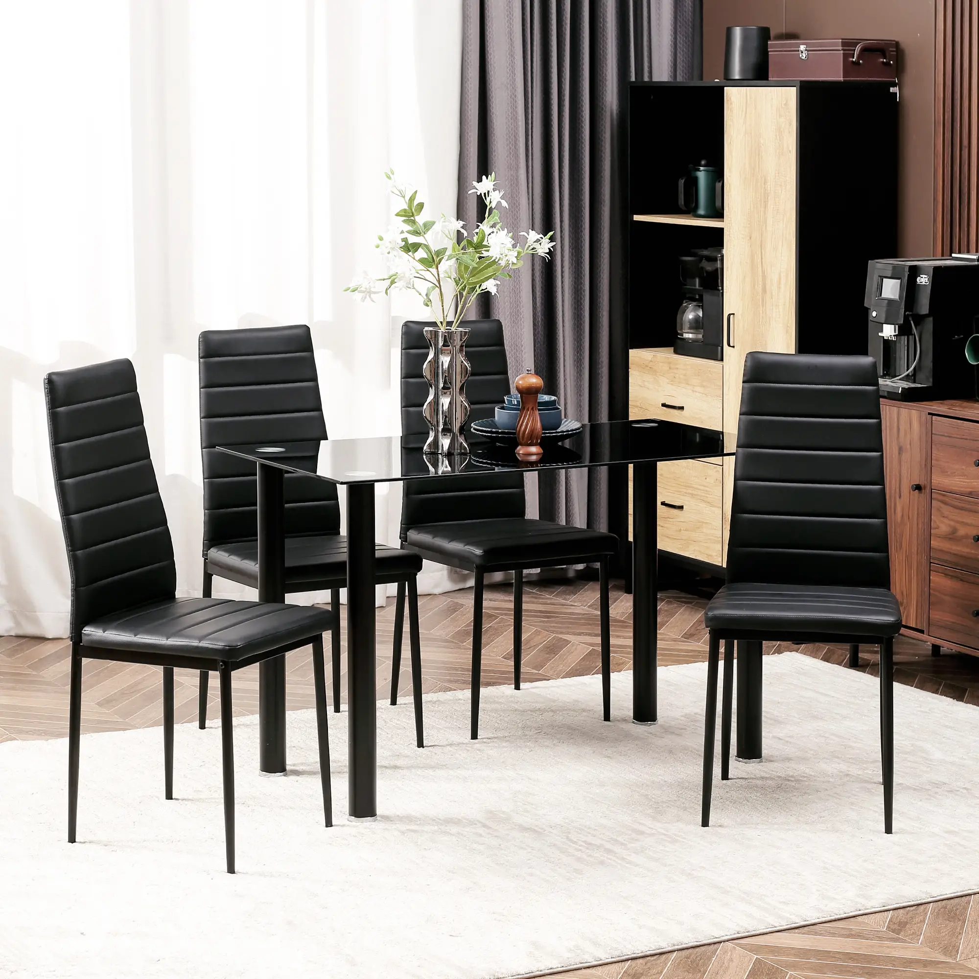 Alakítsa át még a legkisebb szobát is hangulatos étkezővé. Élvezze az étkezéseket családjával és barátaival kényelmesen és stílusosan ennél a HOMCOM étkezőasztalnál és négy széknél. A masszív acélváz kivételesen tartós, míg az elegáns műbőr kárpit könnyen tisztítható. Ha nagyobbnak szeretné látni a szobát és több hasznos helyet nyerni, egyszerűen helyezze a székeket az asztal alá. Hozza be otthonába a konyhaasztalt, és élvezze ki az étkezéseit teljes mértékben.