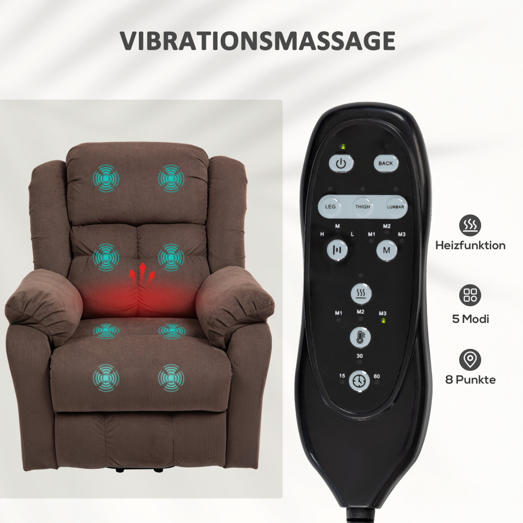 Élvezze a kivételes kényelmet a HOMCOM emelőrásegítéses relaxfotellel! Könnyedén válthat ülő helyzetből 45°-os álló helyzetbe, vagy teljes nyugalomban pihenhet a 150°-os háttámla-döntéssel. Tapasztalja meg a 8 pontos masszázsfunkciót és a melegítő deréktámaszt, mindkettő kényelmesen vezérelhető távirányítóval. A bársonyos szövetkárpit tökéletes, kényelmes pihenővé teszi ezt a relaxfotelt a pihentető estékhez vagy rövid szünetekhez.