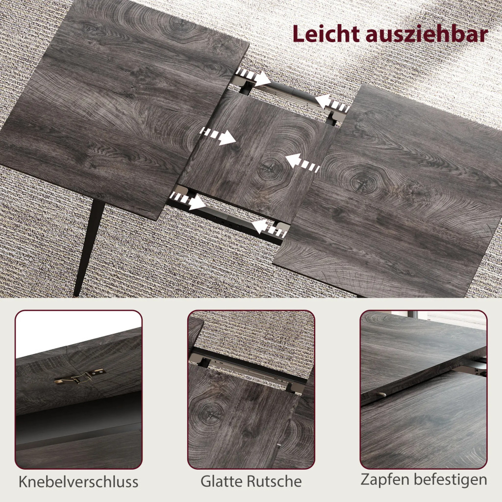 Rugalmas kialakítás: Könnyedén válthat 120 cm és 160 cm hosszúság között az asztal oldalainak sima síneken való elcsúsztatásával és a toldólap behelyezésével. A toldólap az asztallap alatt tárolható.