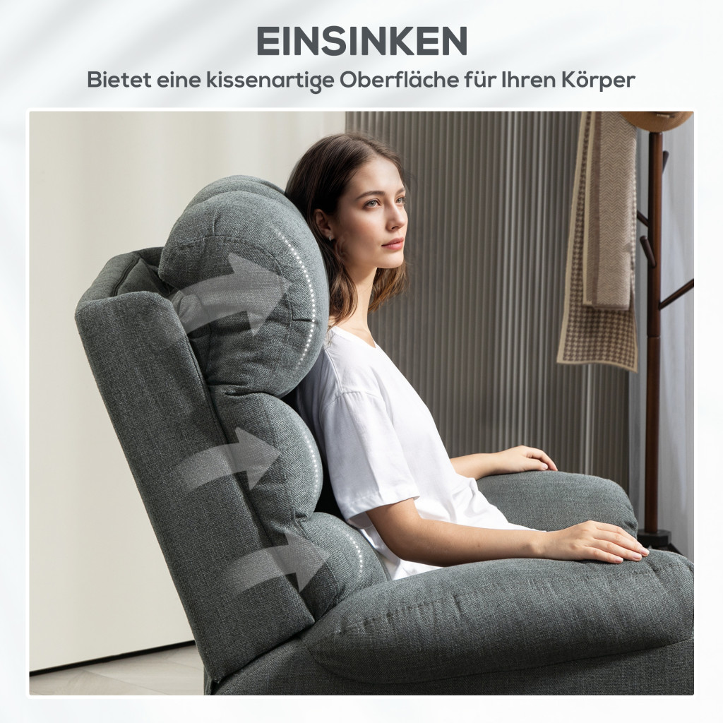 Támasztó kényelem: Ez a TV-relaxfotel tágas, 58 x 58 cm-es üléssel, 26 cm vastag hátpárnával és légáteresztő, víz-, folt- és olajálló vászonhuzattal rendelkezik. A zsákrugók fokozott kényelmet és tartást biztosítanak a pihentető élményhez.