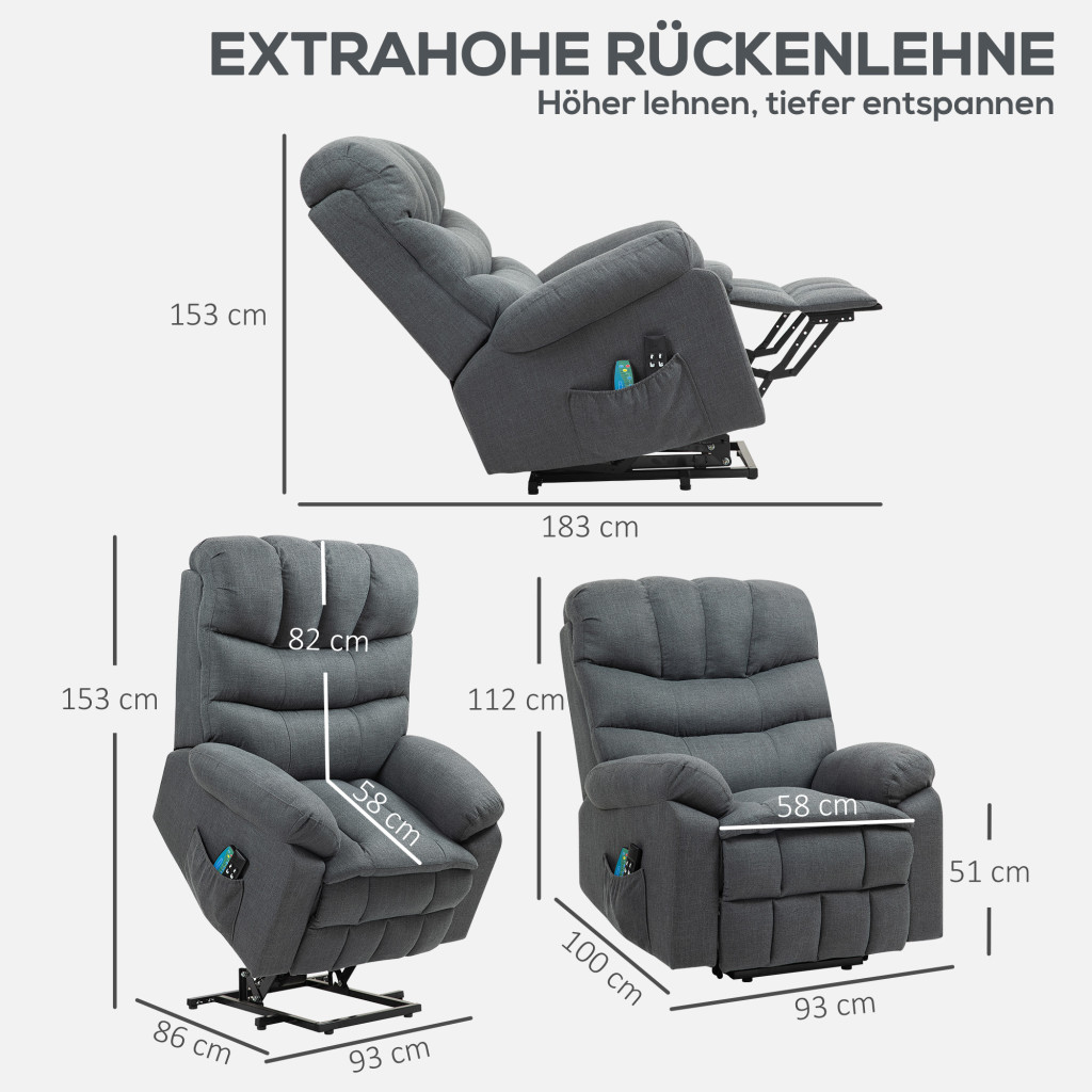 Élvezze a HOMCOM elektromos, emelőfunkciós relaxfotel kényelmét: Három motor külön-külön állítja be a fejtámlát, a háttámlát és a lábtartót (akár 170°-ban), a tágas, 58 x 58 cm-es ülés pedig személyre szabott kényelmet biztosít. Az elektromos emelő akár 45°-os szögben is segít, ami ideális idősek és mozgáskorlátozottak számára. Nyolc masszázspont és légáteresztő anyagból készült derékfűtés gondoskodik a pihenésről, mindezt légáteresztő vászonba csomagolva.