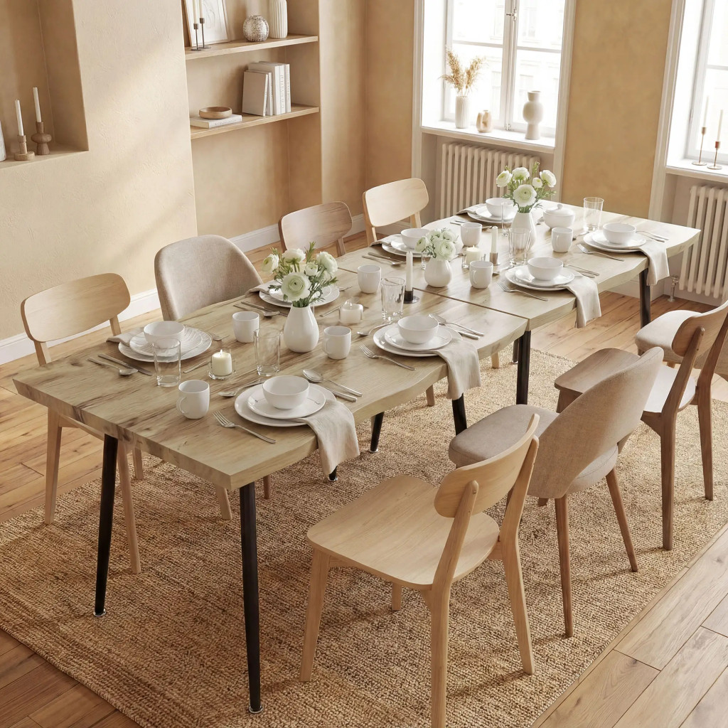 Modern skandináv stílus: A tölgyfa megjelenés, a fekete acéllábak és a lekerekített élek hívogató megjelenést és tömörfa karaktert kölcsönöznek a konyhaasztalnak, így stílusos kiegészítője a modern otthonoknak.