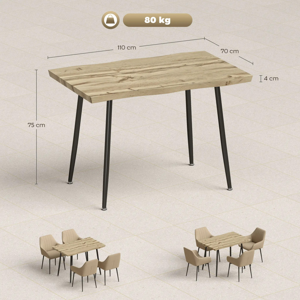 Vigyen skandináv stílust és funkcionalitást szobájába a HOMCOM étkezőasztallal. A 4 cm vastag tölgyfahatású asztallap és a masszív acélváz akár 80 kg-ot is elbír – tökéletes étkezéshez, munkához, kézműveskedéshez vagy játékestekhez. Az állítható magasságú lábak stabilitást biztosítanak egyenetlen padlón, a modern, elegáns kialakítás pedig stílusos központi elemmé teszi bármely otthonban.