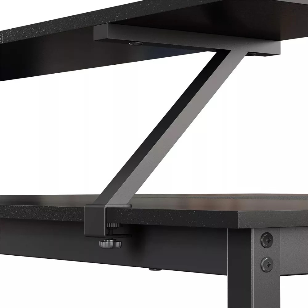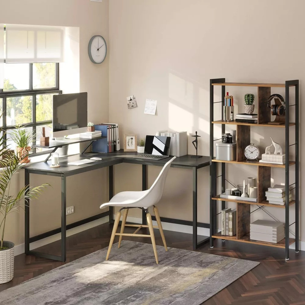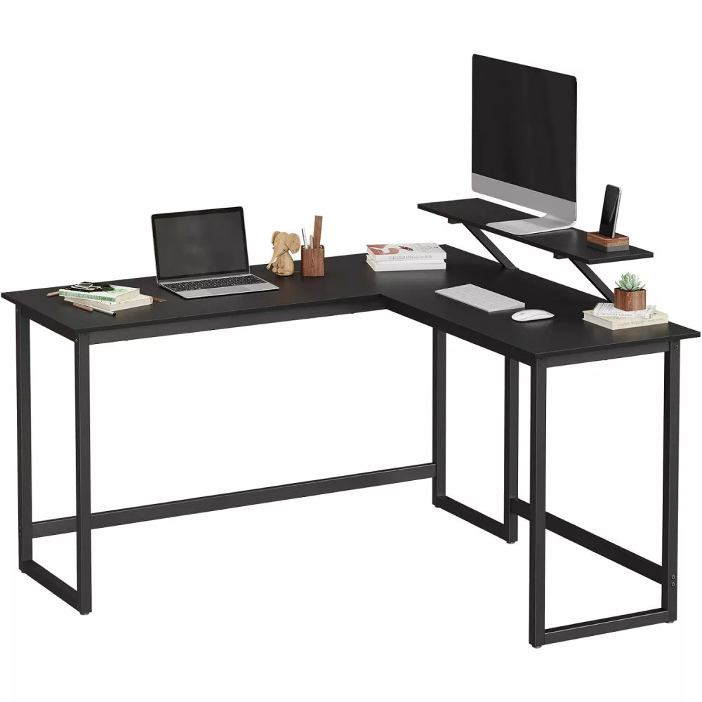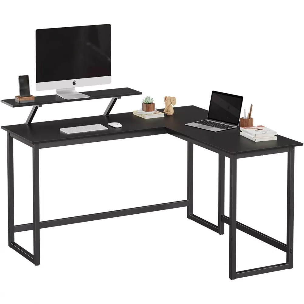 Egy kicsit gyakorlatiasabb: Ez a stílusos, fekete számítógépasztal nemcsak lenyűgöző L-alakú és minden sarokba illeszkedik, hogy helyet takarítson meg, hanem egy praktikus, 20 x 90 cm-es monitorállvánnyal is fel van szerelve, amelyet az asztal szélén bárhol rögzíthet.