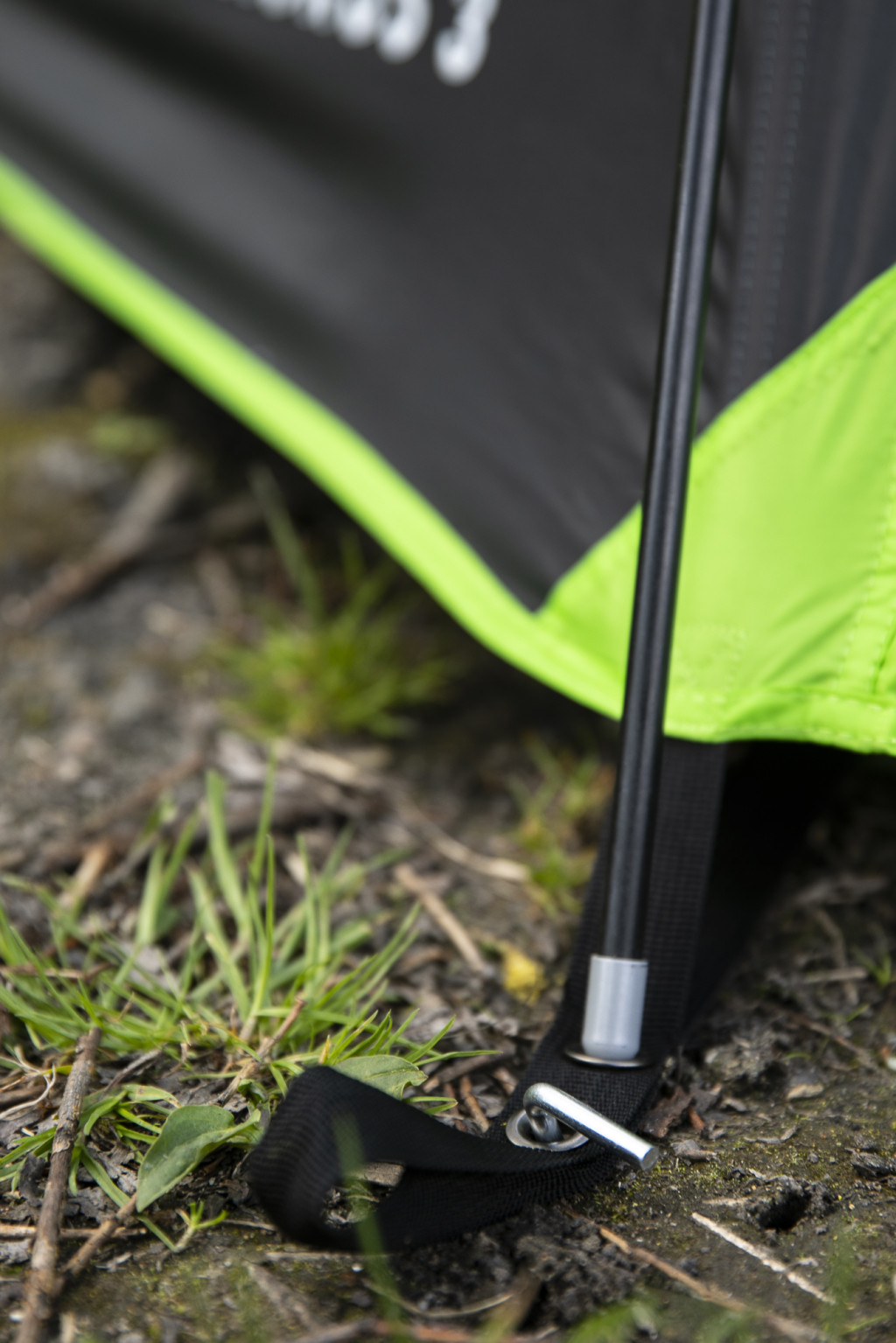 A sátor alagút kialakítású, rugalmas és tartós üvegszálas vázzal. Nagyon könnyen és gyorsan felállítható és lebontható.