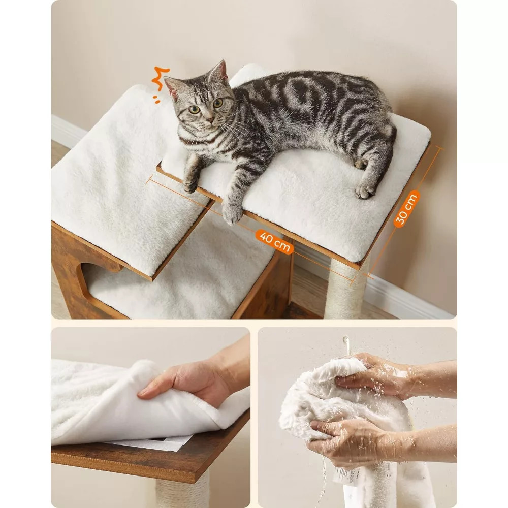 Tiszta, bújós macskáknak: A bolyhos párnák tépőzárral vannak rögzítve a platformokhoz és a kunyhóban. Könnyen eltávolíthatók és tisztíthatók is.