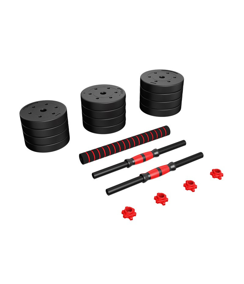 A készlet tartalma: 2 rúd (egyenként 0,5 kg), csatlakozó, 4 bilincs, 16 súlylap - 1,25 kg (4 db), 2,5 kg (4 db), 3 kg (8 db)