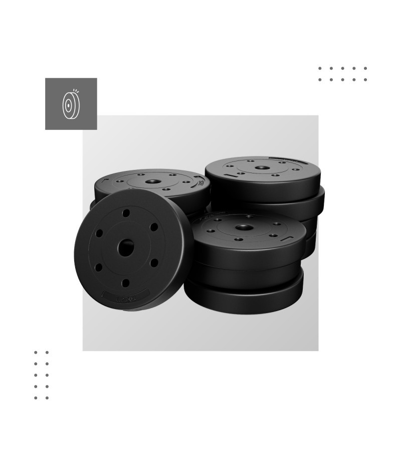 A súlylapok bitumenes masszával vannak feltöltve. A műanyag bevonat megakadályozza, hogy a lemezek megsérüljenek a talajjal való érintkezés során. Ezenkívül tompítja a hangokat, és megakadályozza, hogy a padló a padlóhoz érjen, amikor a súlyzókat leejtik. Ennek köszönhetően edzése mindig csendes és kényelmes lesz.