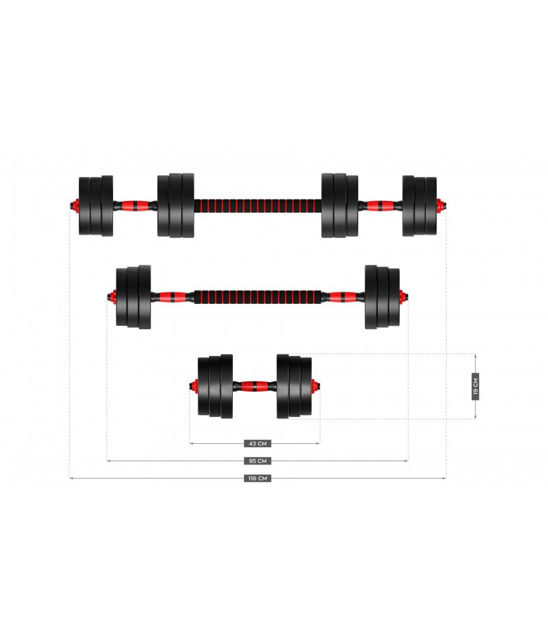 Két csatlakozóval ellátott kompozit súlyzókészlet lehetővé teszi a terhelések kétféle módon történő elosztását - szélesebb és keskenyebb markolattal. Ennek köszönhetően könnyedén végezhet gyakorlatokat a test minden részére.