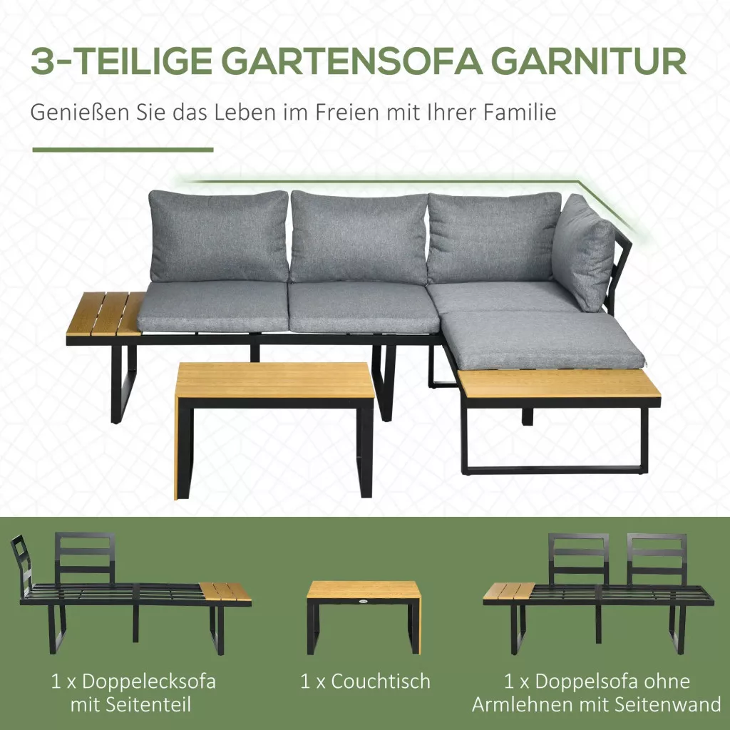 Háromrészes kerti bútor szett: Ez az alumínium teraszbútor szett egy sarokkanapéból, egy karfa nélküli kétszemélyes kanapéból és egy hozzá illő oldalsó asztalból áll, ideális a pihentető estékhez a szabadban családdal és barátokkal.