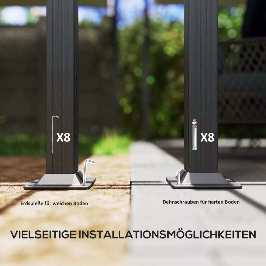 Biztonságos telepítés: A kerti pavilon nyolc oszloppal és nyolc feszítőhorgonnyal rendelkezik, így biztonságosan telepíthető mind puha, mind kemény felületekre a megbízható stabilitás érdekében.