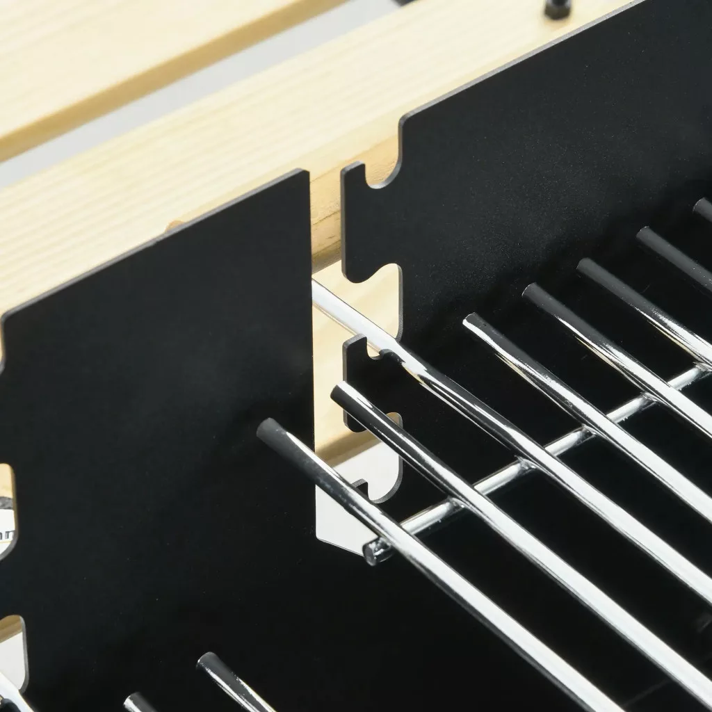 Állítható grillezési magasság: A grillráccsal négy különböző magasságba állítható. A fa fogantyúk kényelmes és biztonságos beállítást és mozgatást tesznek lehetővé az égési sérülések veszélye nélkül. Élvezze az ízlésének megfelelő, személyre szabott grillezési élményt.