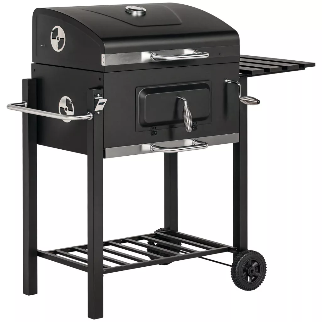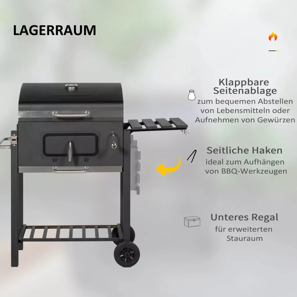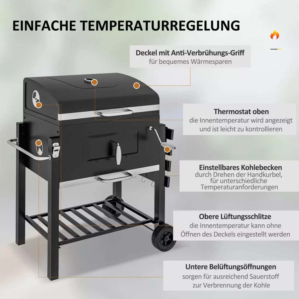 Könnyen mozgatható: A grillsütő két kerékkel van felszerelve a mobilitás és a könnyű szállítás érdekében. Teljes méretek: 113 cm hosszúság x 65 cm szélesség x 108 cm magasság