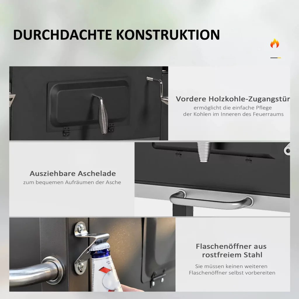 Kifinomult kialakítás: A faszénsütő üvegnyitóval van felszerelve, a rozsdamentes acél fogantyúk pedig hőállóak és védenek az égéstől. A kihúzható alj felfogja a hamut, és grillezés után könnyen tisztítható.