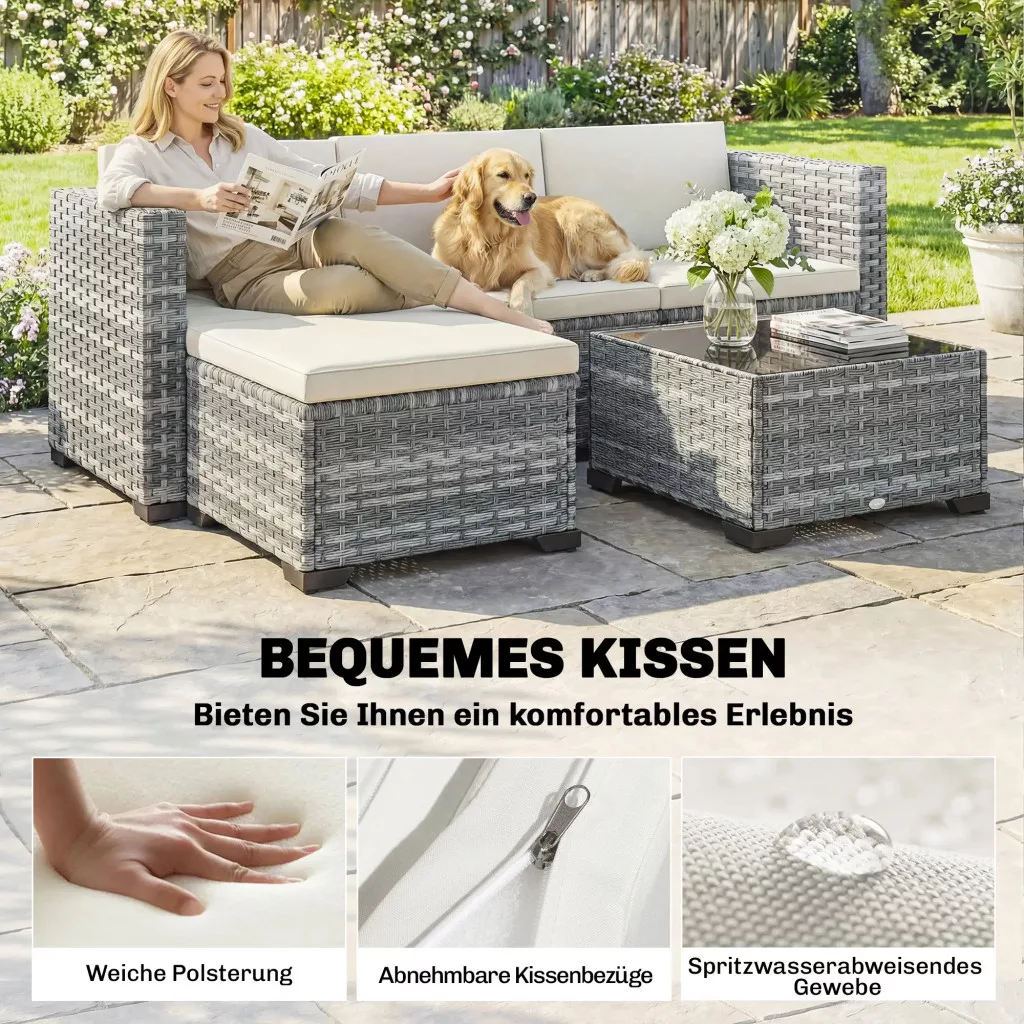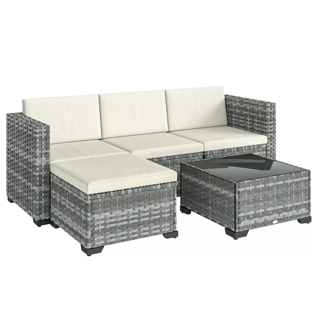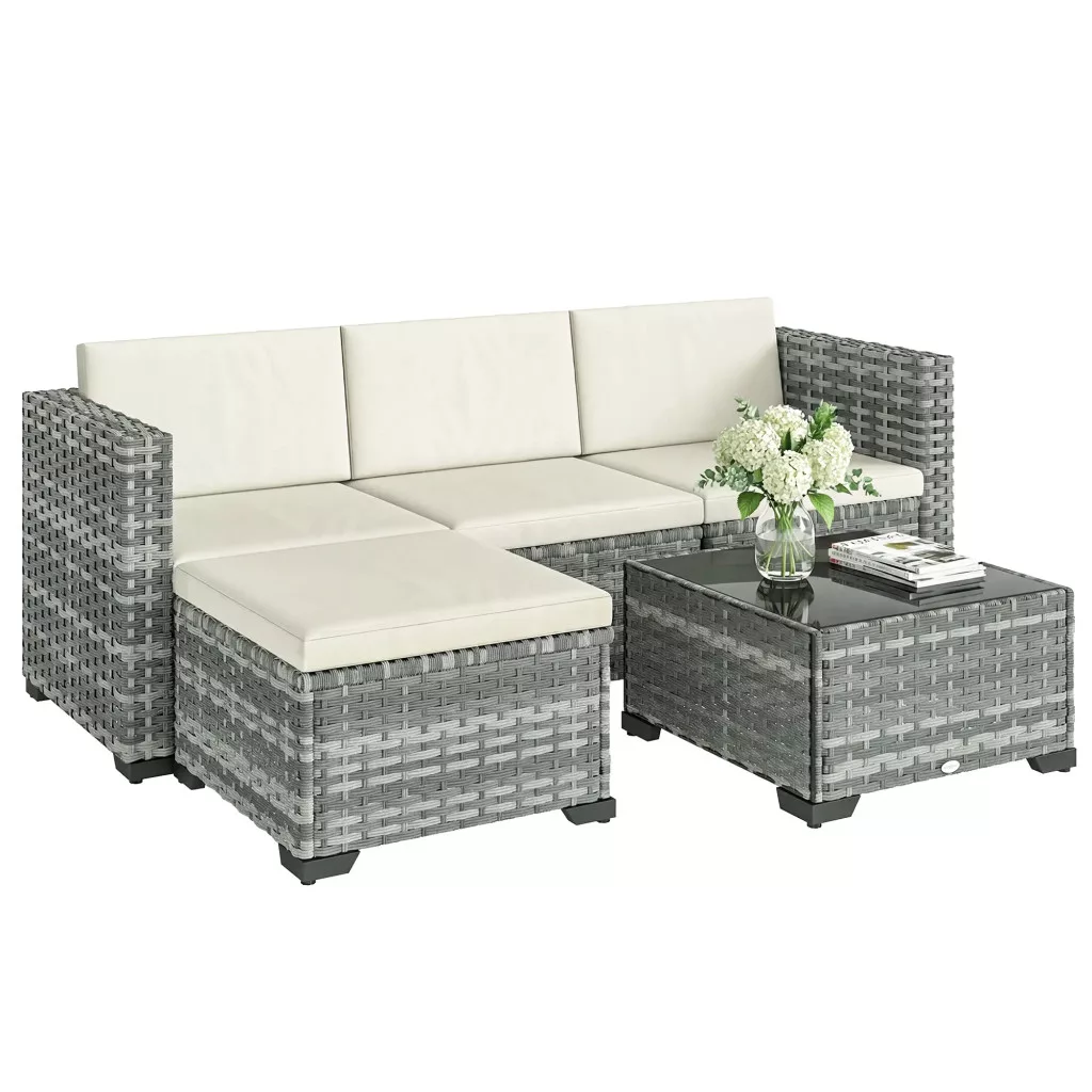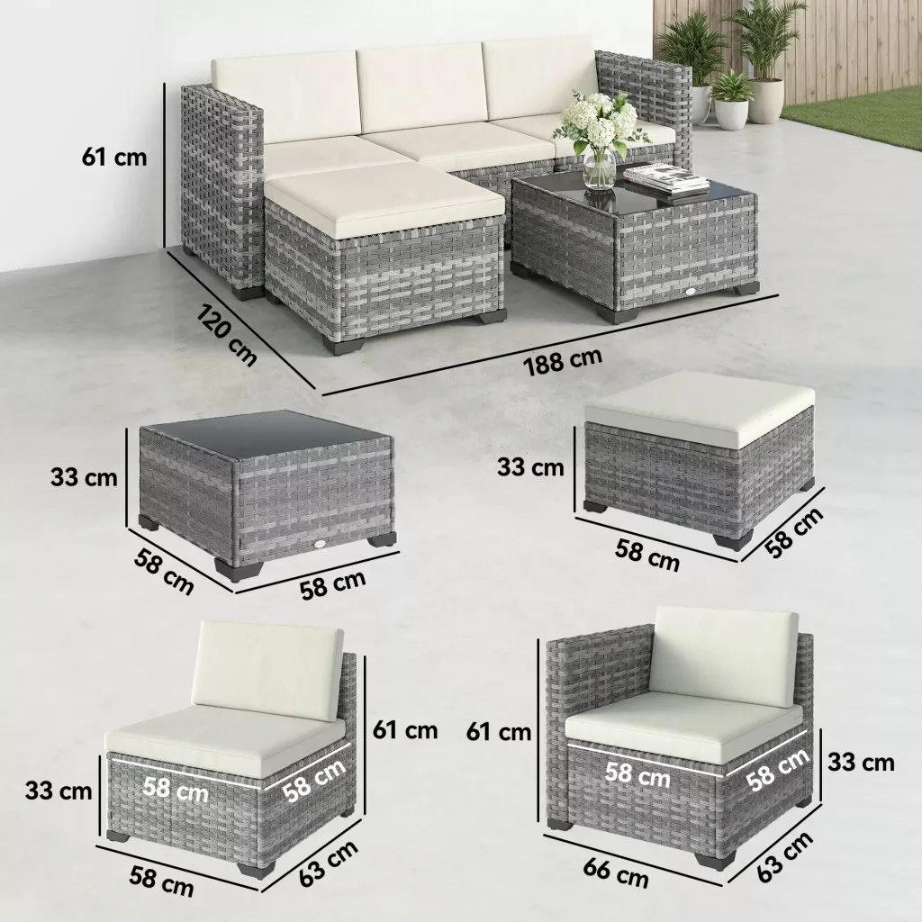 Zsöknek érződik a teraszod a fix bútorok miatt, ami megnehezíti a vendéglátást és nem használja ki teljesen a teret? Az öt darabos Outsunny L-alakú kerti pihenősarok ideális elrendezést kínál bármilyen összejövetelhez. Tartós acélvázzal és PE rattannal készült, 5 cm vastag párnákkal pedig kényelmet biztosít. A levehető huzatok megkönnyítik a takarítást, és sokoldalú oázissá varázsolják kertedet a pihenéshez.