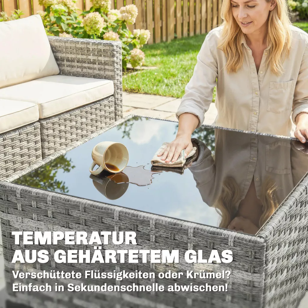 Edzett üveg asztal: Stílusos dohányzóasztal rattan szegéllyel, ideális teraszbútorokhoz. Biztonságos felületet biztosít italoknak, harapnivalóknak és könyveknek, és könnyen letörölhető kiömlés esetén.