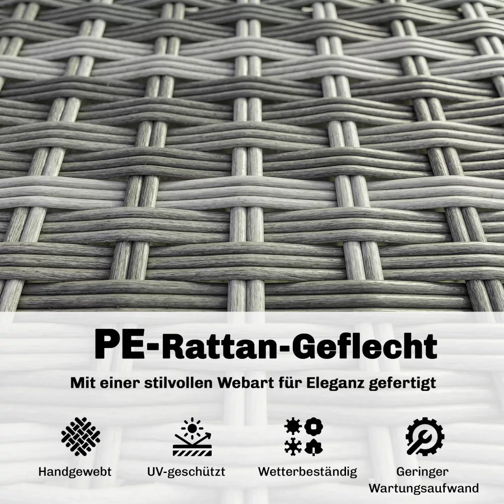 Időjárásálló konstrukció: A porszórt acélváz és a tartós PE rattan természetes megjelenést és hosszú élettartamot biztosít. Ennek a kis kültéri pihenőgarnitúrának az UV- és vízálló anyaga megakadályozza a fakulást, a repedést és a nedvesség okozta károsodást – ideális a mindennapi kültéri használatra.