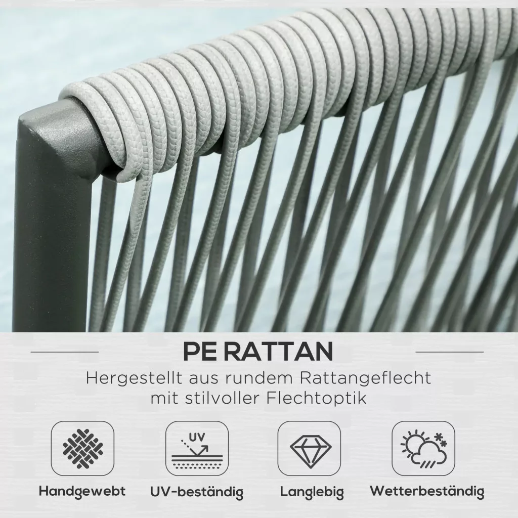 Alumínium szintetikus rattannal: A masszív és könnyű, porszórt felületű alapkeret kiváló minőségű, kerek szintetikus rattan szövéssel van bevonva, így dupla réteget képez a nagyobb szilárdság és tartósság érdekében.