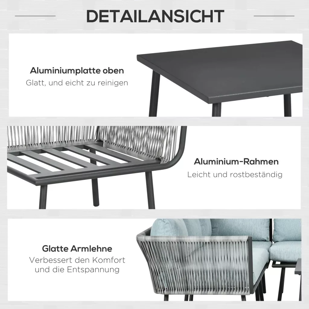 Élvezze a pihentető délutánokat ezzel az Outsunny kültéri ülőgarnitúrával. A négyrészes szett két dupla sarokkanapéből, egy sarokkanapéből és egy négyzet alakú dohányzóasztalból áll, könnyű alumínium alapkerettel, amely masszív szerkezetet biztosít. Az asztal vonzó alumínium felülettel rendelkezik, és magassága a fotelekhez igazítható, így tökéletes hely arra, hogy minden szükséges holmiját kéznél tartsa.
