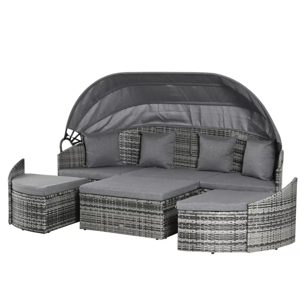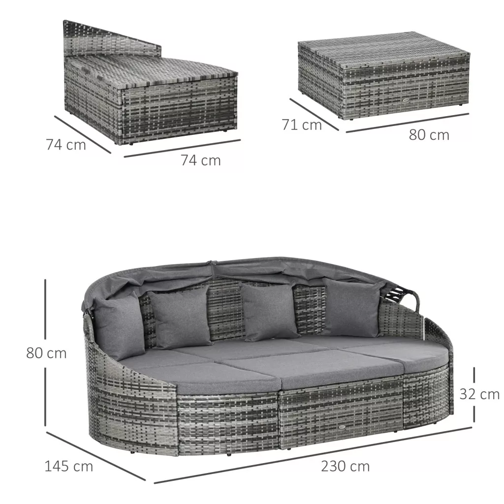 Trendi és sokoldalú PE rattan ülőgarnitúra az Outsunny-tól. A szett egy háromszemélyes kanapéból, két lábtartóból és egy lábtartóból áll. A horganyzott csőváz erős és robusztus szerkezetet biztosít, PE rattan borítással az időjárás viszontagságai ellen. A szettet levehető és mosható huzatokkal ellátott, párnázott ülőpárnák, valamint egy nagyméretű baldachin teszi teljessé.