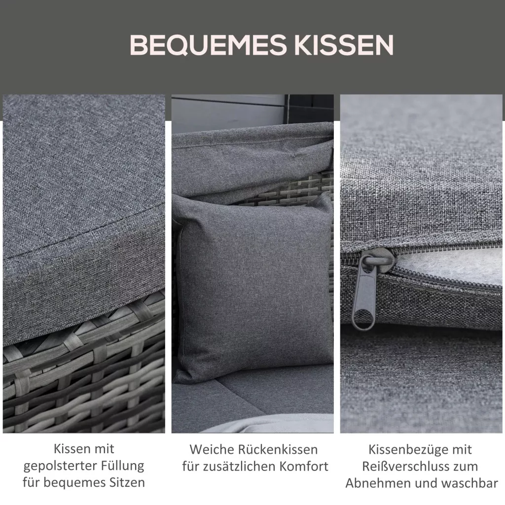 KÉNYELMES PÁRNÁK: Ez a PE rattan pihenőgarnitúra elegáns dizájnnal büszkélkedhet. A puha, párnázott párnák teljes kikapcsolódást biztosítanak. A cipzáras párnahuzatok levehetők és moshatók.