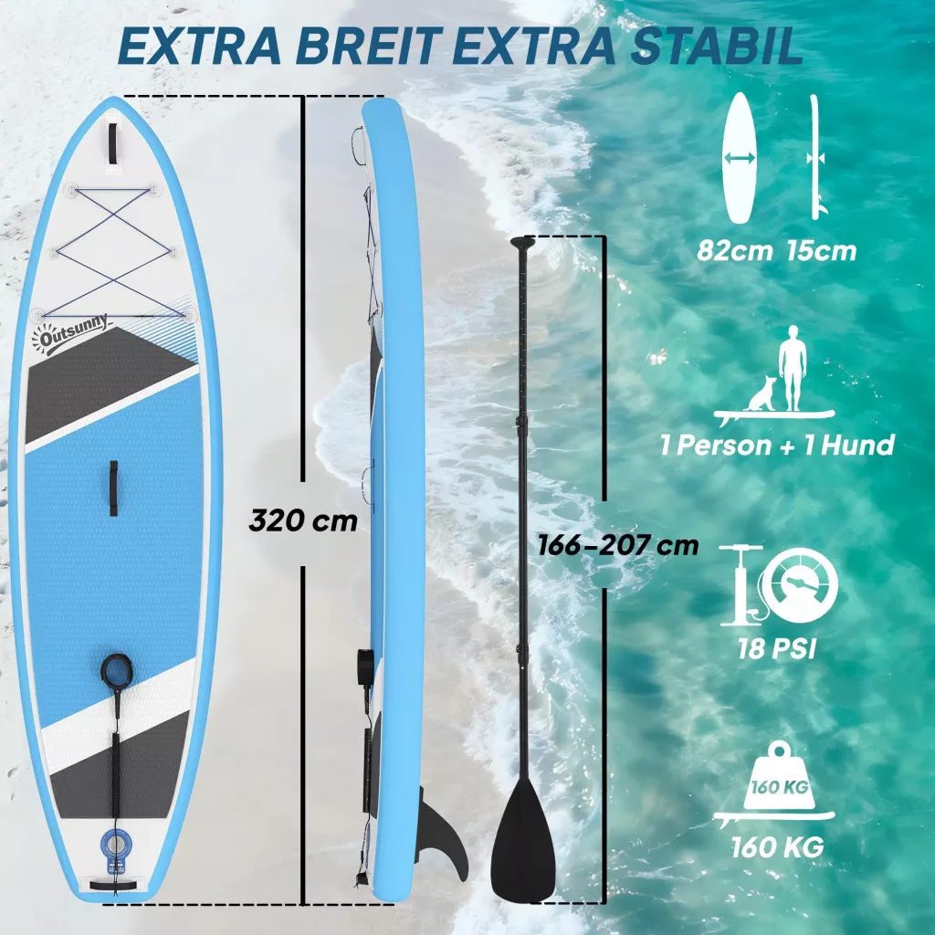 Élje át a vizet nyugodt, stabil és stresszmentes módon. Az Outsunny felfújható álló evezős deszka kényelmet, biztonságot és magabiztosságot kínál. 320 x 82 cm-es méretével és 160 kg teherbírásával ez az álló evezős deszka optimális egyensúlyt és teret biztosít. Tökéletes kezdőknek, családoknak és nehezebb testsúlyú felhasználóknak, akik a biztonságos és stabil utazást részesítik előnyben. Ideális mindenkinek, aki értékeli a nyugodt evezést.