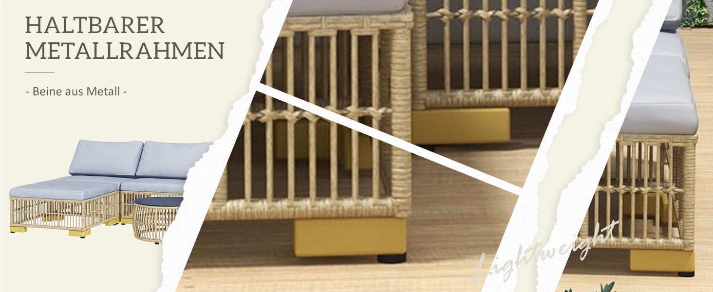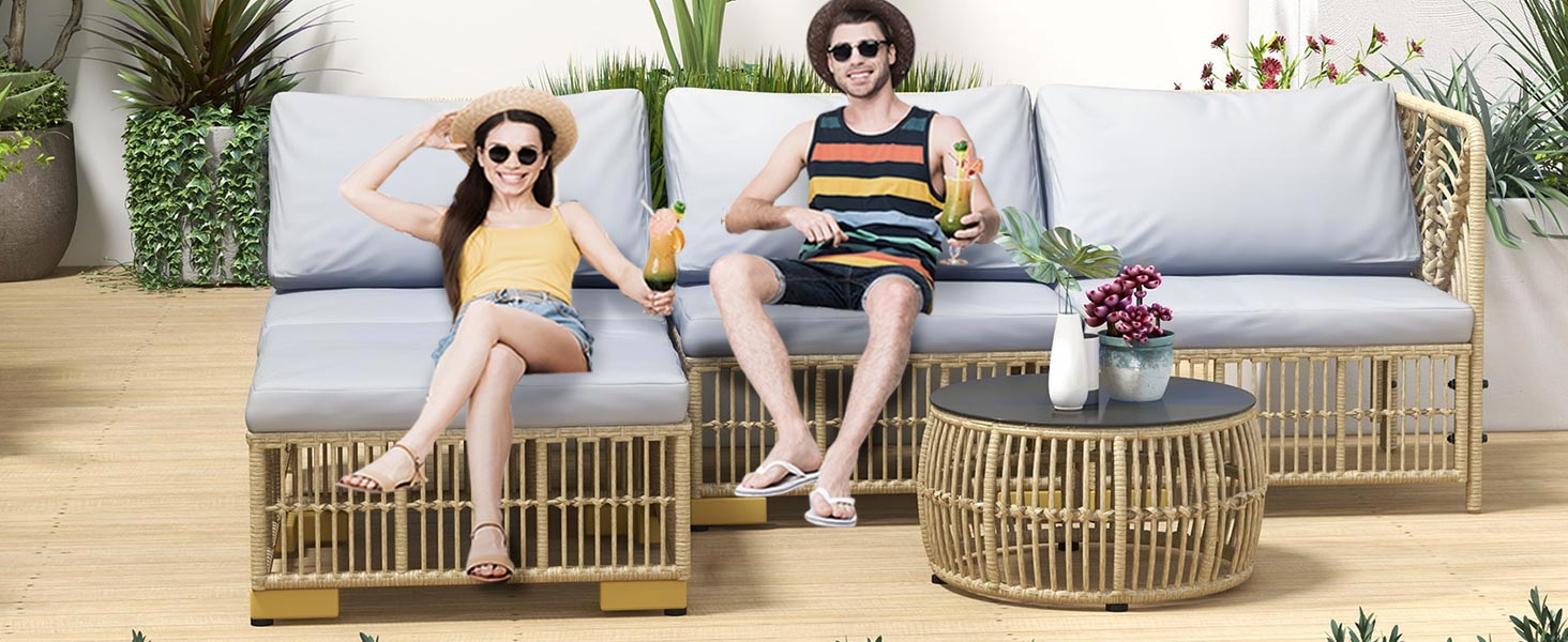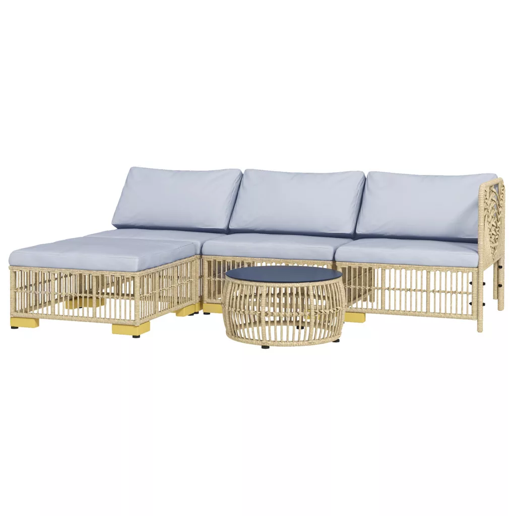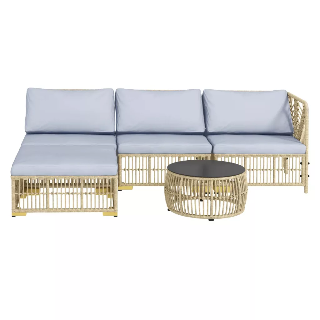 5 darabos szett: Rattan kerti bútor szettünk két karfa nélküli fotelt, egy sarokkanapét, egy lábtartót és egy kerek dohányzóasztalt tartalmaz, amelyek kényelmesen elférnek akár négy fő számára. A különböző konfigurációs lehetőségek sokoldalú kombinációkat tesznek lehetővé, hogy bármilyen hangulathoz vagy alkalomhoz illeszkedjenek – ideálisak kertbe, teraszra, fedélzetre vagy medence környékére.