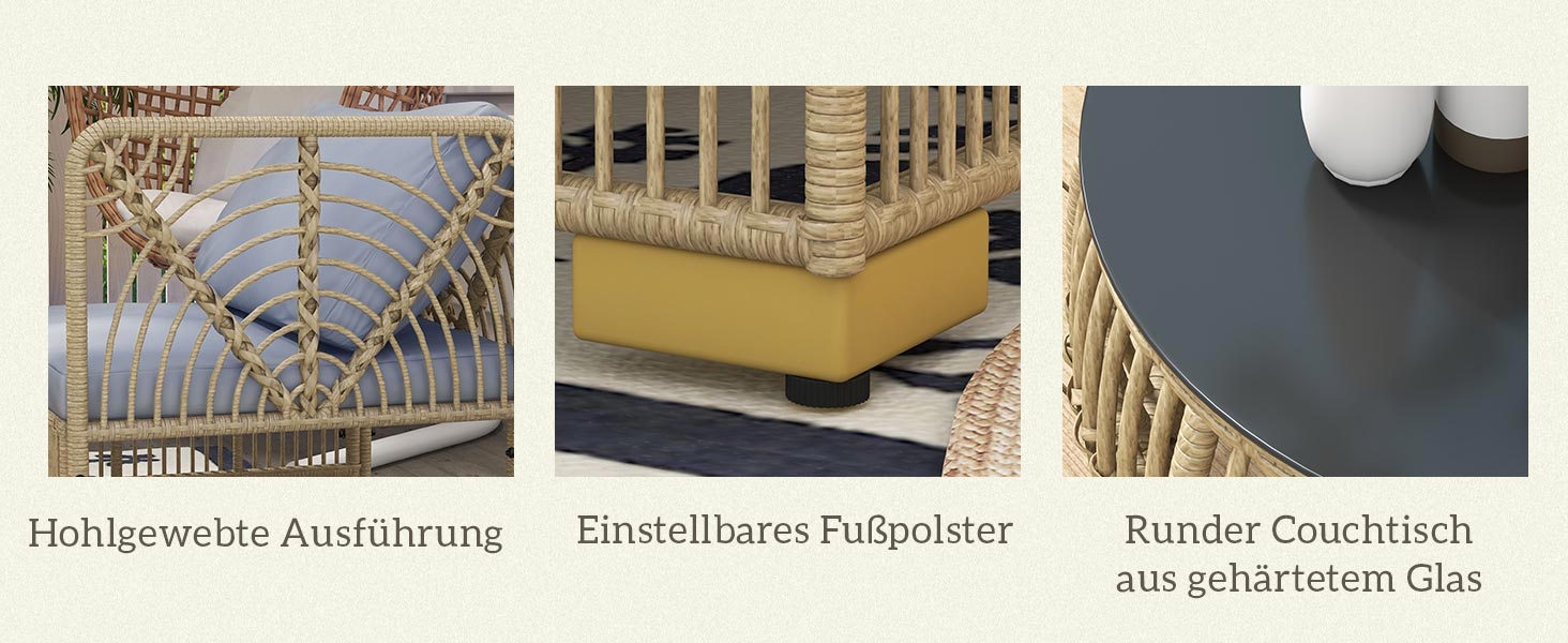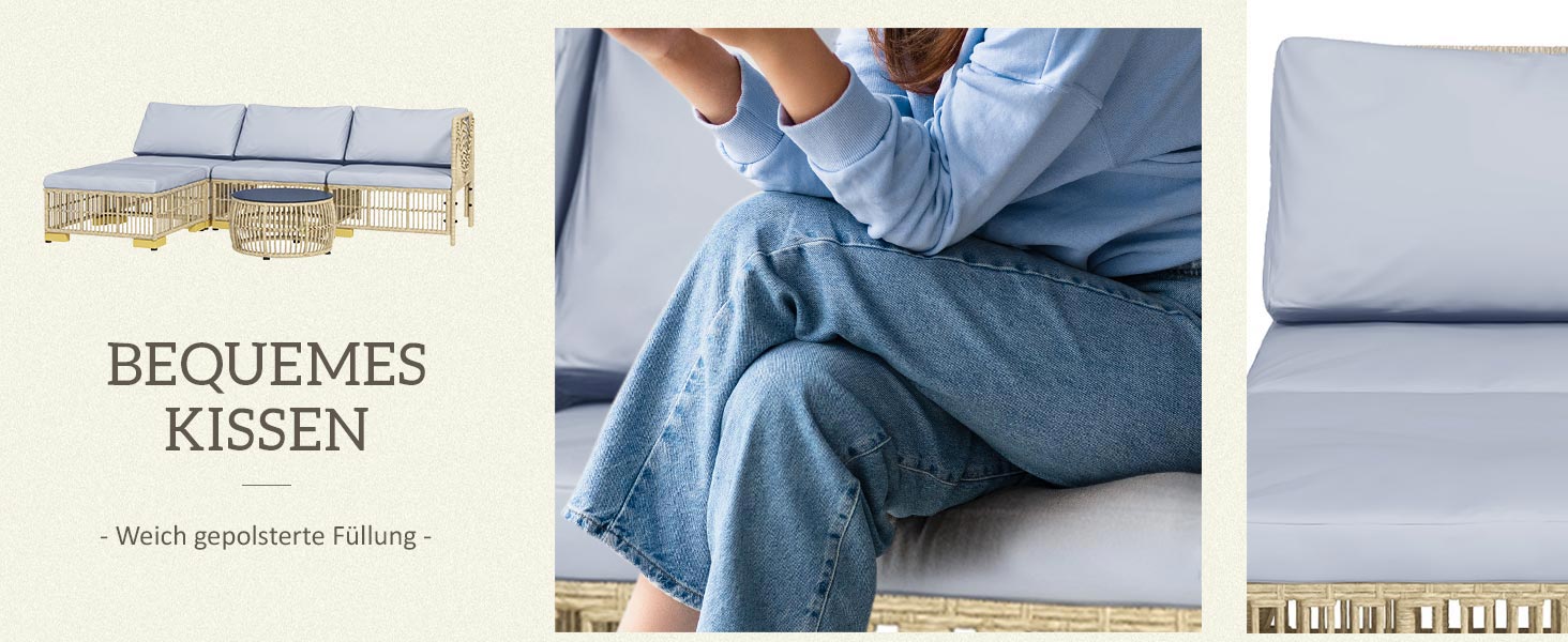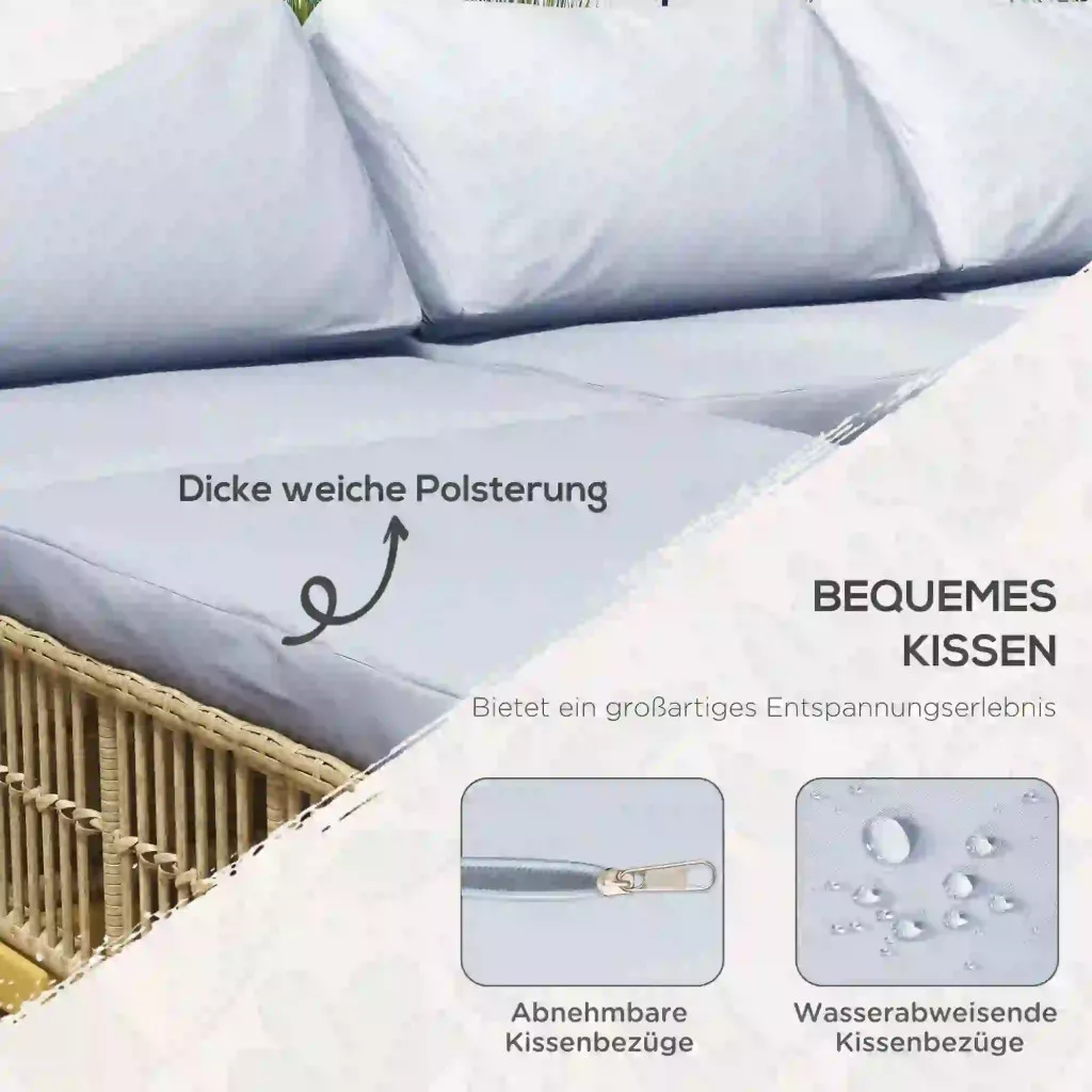 Kényelmes ülőélmény: Élvezze a maximális kényelmet ezzel a kültéri bútor szettel. A puha párnázású ülő- és hátpárnák gyengéd, mégis támasztó kényelmet biztosítanak testének, biztosítva az igazán kellemes ülési élményt. A nagyobb kényelem érdekében minden párnahuzat cipzárral rendelkezik, így könnyen levehető és mosható.