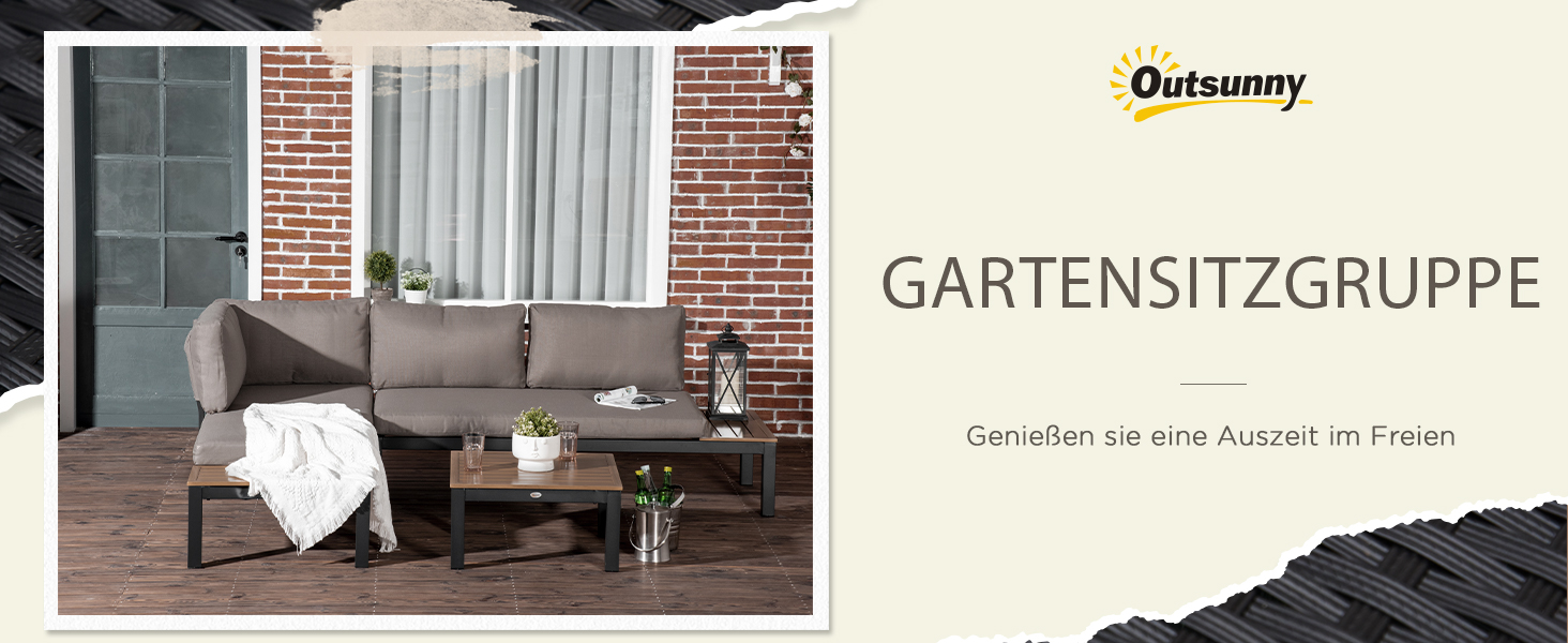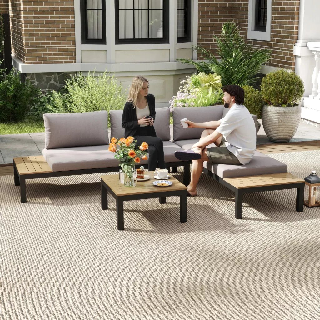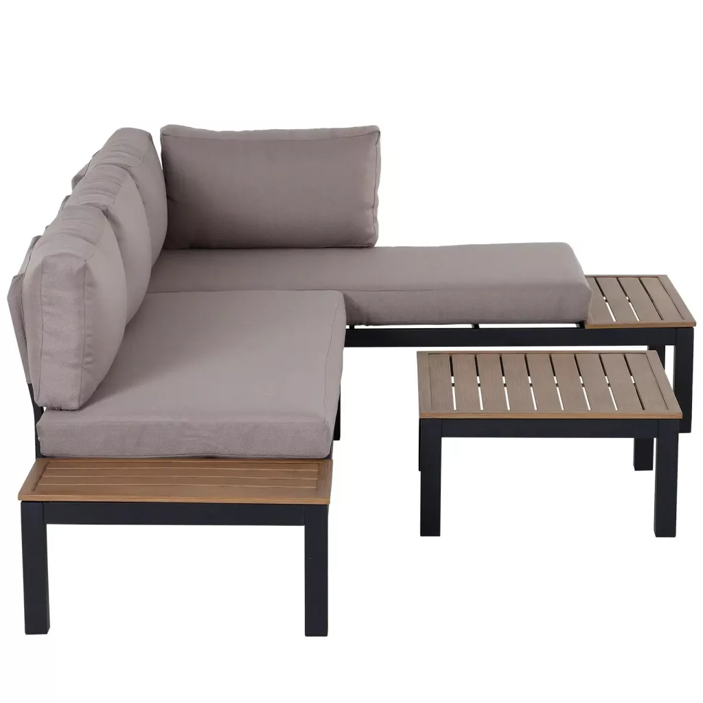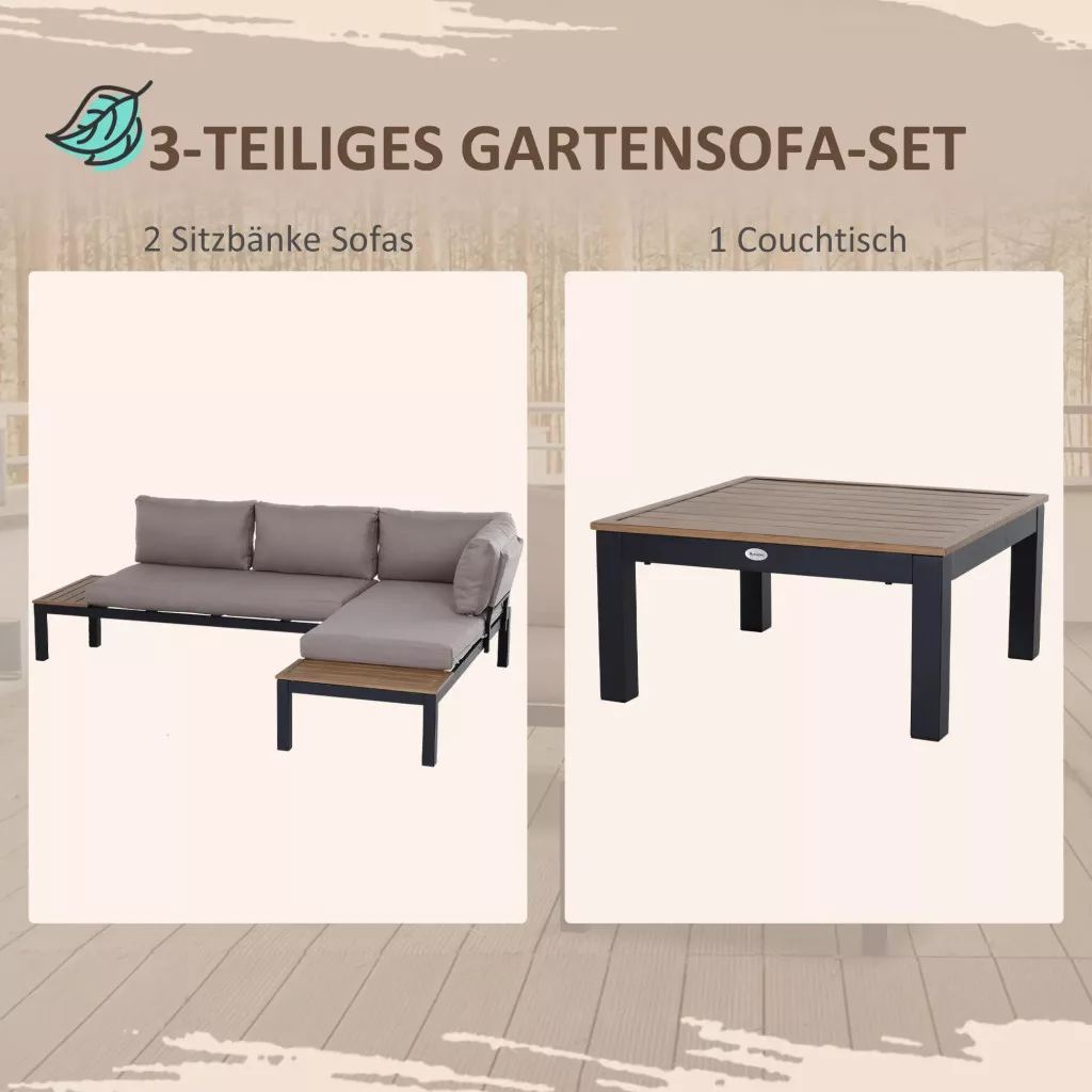 Ez a háromrészes kerti bútorgarnitúra lehetővé teszi, hogy újra felfedezd a lényeget. Az alumínium váz tartósságot és szilárdságot biztosít, rozsdaálló és könnyű, így könnyen mozgatható. A vastagon párnázott ülő- és hátpárnák kényelmes ülést biztosítanak, míg a kanapé rácsos dohányzóasztala és oldalsó tálcája bőséges tárolóhelyet kínál, és könnyen tisztítható.