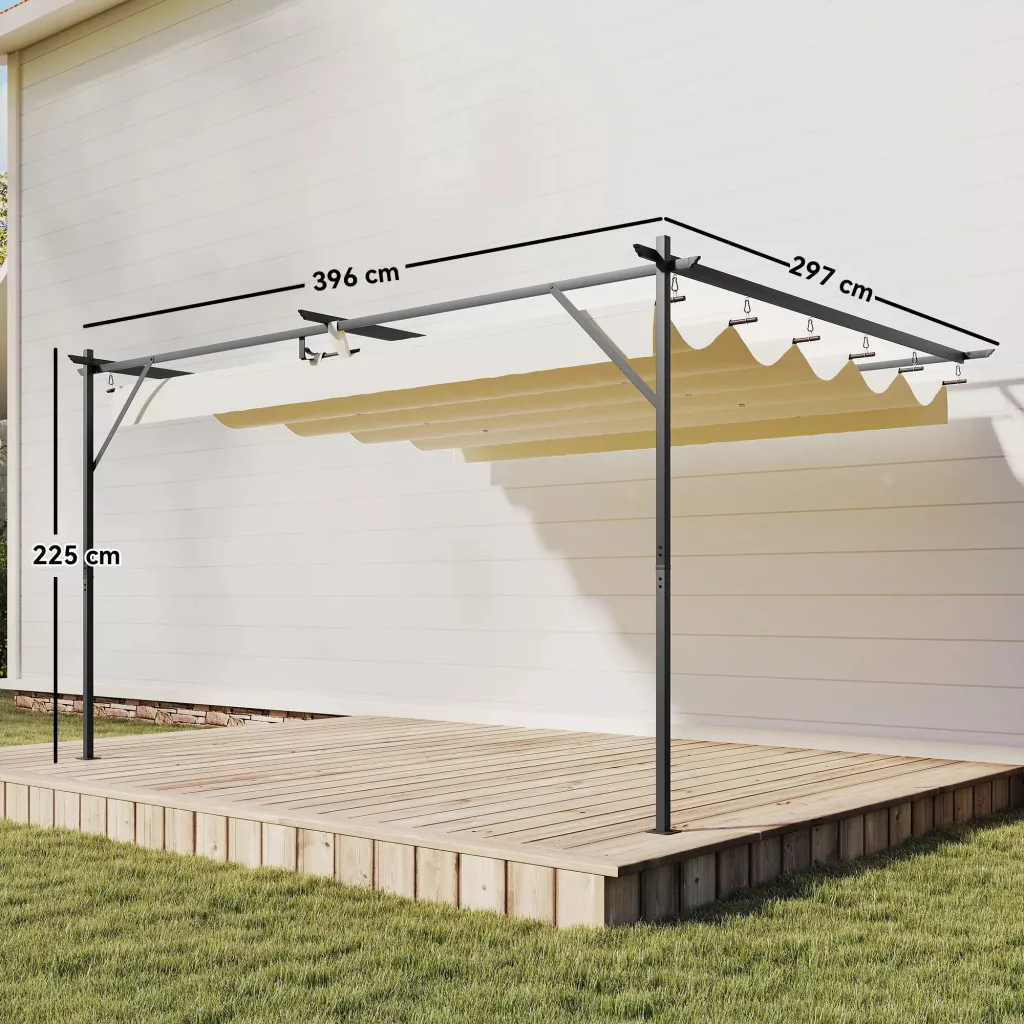 Fedezze fel az Outsunny teraszfedésének varázsát, amely kihúzható tetővel rendelkezik, UV30+ védelmet nyújtva – ideális a napsütéses napokra. Rozsdamentes acélvázból és átlós tartóoszlopokból készült, amelyeket talajhorgonyok vagy feszítőcsavarok rögzítenek, ez a kerti pergola stabilitást biztosít a mindennapi kültéri használatra. Ez a kerti tető stabil és élvezetes kültéri élményt ígér.