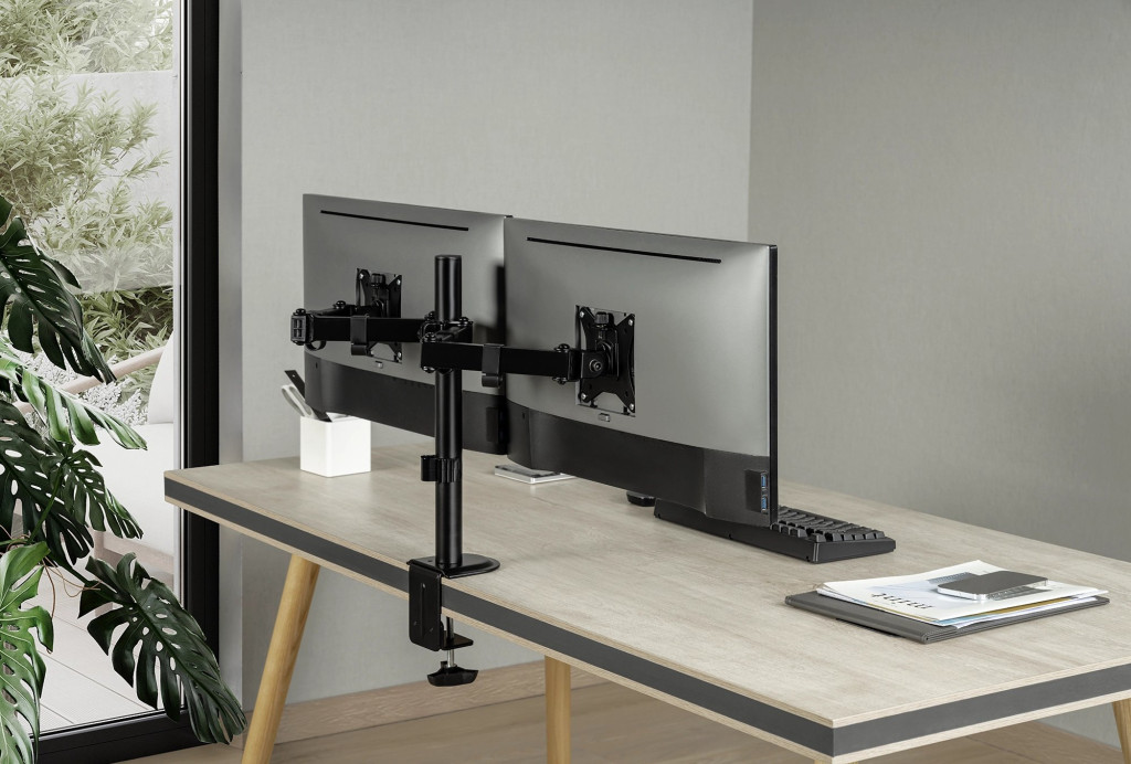A SENSE7 FLOAT DOUBLE monitortartó két karral rendelkezik, így tökéletes két képernyő asztalra szereléséhez.