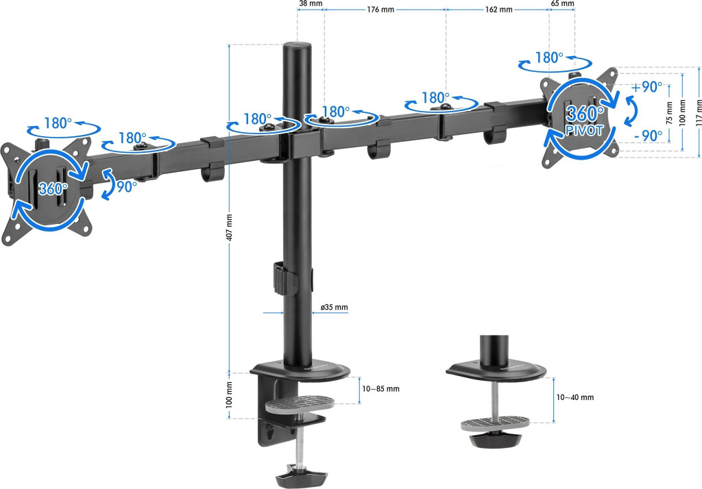 A kar kétféle rögzítési móddal rendelkezik: szorítással vagy fúrással. A szorítók közötti távolság 10-85 mm, így a tartó gyakorlatilag bármilyen asztalra felszerelhető.