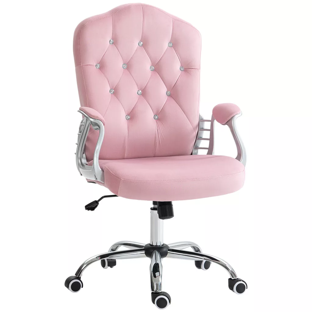 Az irodai szék dekoratív dizájnja csillogó kristálygombokkal a kárpitozott háttámlán