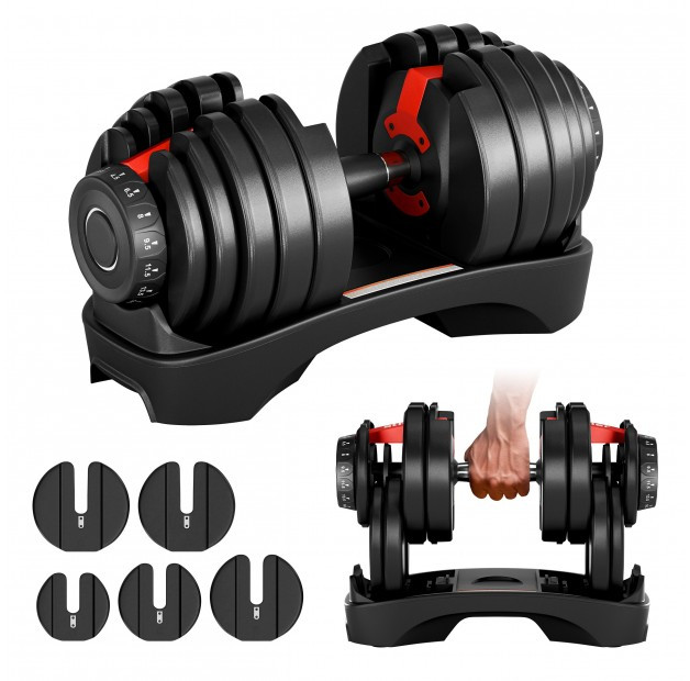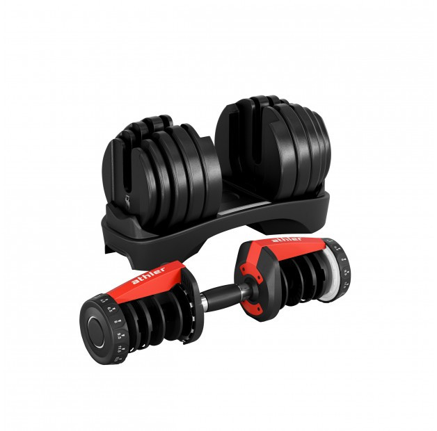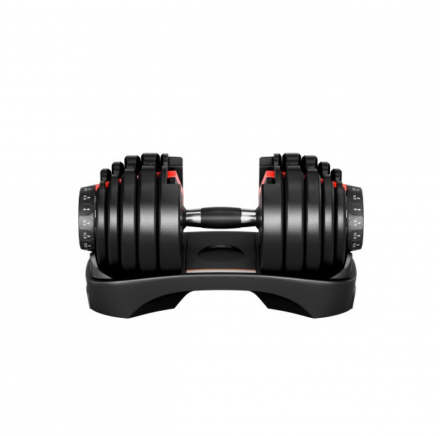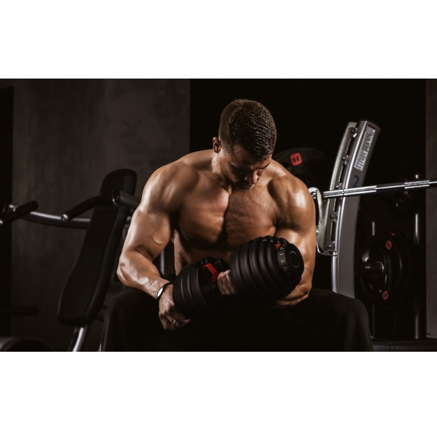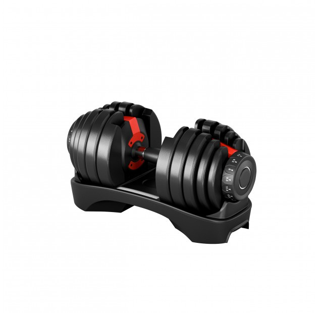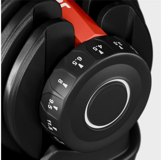 - A terhelésbeállítása nagyon egyszerű. Helyezze a súlyzót az állványra, és az oldalán lévő gombokkal állítsa be a rendelkezésre álló terhelési értékek egyikét: 2,5 kg / 3,5 kg / 4,5 kg / 5,5 kg / 6,5 kg / 8 kg / 9 kg / 10 kg / 11,5 kg / 13,5 kg / 16 kg / 18 kg / 20,5 kg / 22,5 kg / 24 kg.