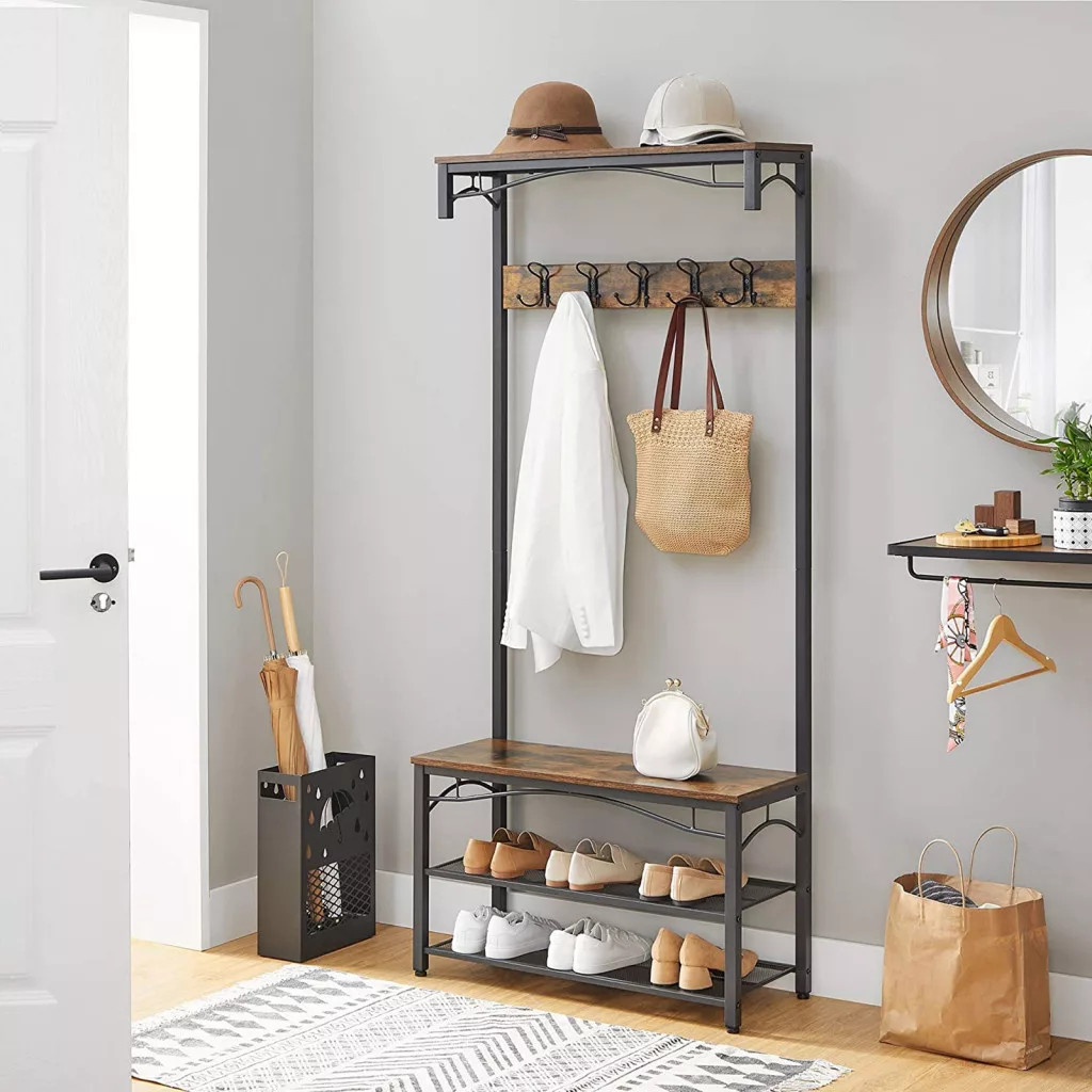 Minden, Amire Szüksége Van: Miután hazaérkezik a nap végén, csak akassza fel kabátját, kalapját és sáljait a felső 5 kettős horogra, üljön le a padra, hogy levegye cipőjét, és helyezze azokat a 2 fém hálós tárolópolcra